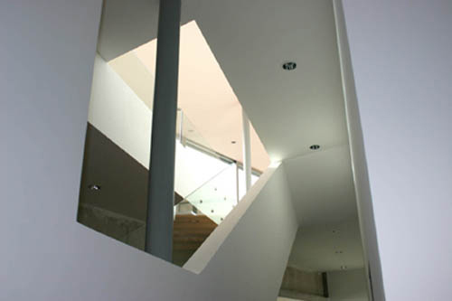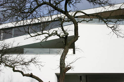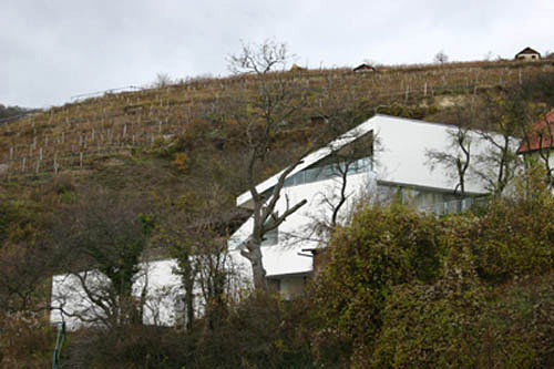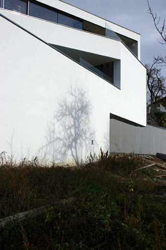 Die Herausforderungen an die Konstruktion des Hauses waren extrem: steilste Hanglage, stützenfreie Einfahrt, sowie eine Gebäudegeometrie, die aufgrund der nicht belastbaren Bestandsmauern und der freien Grundrisse die Lastabtragung nur an einigen wenigen Punkten zuließ. Dies erforderte den Einsatz von vorgespanntem Stahlbeton, einer Bautechnologie aus dem Brückenbau. Erschwerend kam hinzu, dass die Bauteile besonders schlank dimensioniert werden mussten, da sie aufgrund energetischer Anforderungen wiederum besonders stark zu dämmen waren. Das Haus ist als Niedrigenergiehaus ausgeführt. Dies wurde im Wechselspiel höchster Dämmwerte von Decken, Wänden und Gläsern, Sonnenenergieeintrag über großzügige Verglasungen als auch über Kollektoren, speicherwirksamer Masse im Inneren, Sonnenschutz im Außenbereich sowie einer kontrollierten Wohnraumbelüftungsanlage erreicht. Der immer wieder ins Treffen geführte Widerspruch zwischen energiebewusster und völlig freier Architektur im Dienste von Landschaft und Wohnlandschaft scheint ausgeräumt zu sein. Wir glauben, dass sich im zwanglosen, nun sichtbaren Ergebnis des Gesamtprozesses auch die anerkennende und tatkräftige Unterstützung durch die Bauherren widerspiegelt. (Text: Architekten)