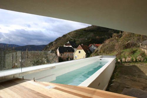 Lage und Geometrie der Natursteinmauern sowie des Weinkellers standen nun als Prämissen am Anfang des Entwurfsprozesses. Unter Aufnahme dieser vorgegebenen Richtungen entwickelten wir ein frei schwingendes Raumgebilde, das einerseits zwischen den bestehenden Höhenlagen des Marillengartens, des Wiesengartens und des Nutzgartens vermittelte und als bewohnbare Ebenen in sich aufnahm, andererseits die funktionalen Wünsche der im besten Sinne anspruchsvollen Bauherrschaft erfüllte. Nach der Ankunft im Carport, über dem das ganze Haus frei tragend zu schweben scheint, gelangt man über eine Treppe entlang der Steinmauer des ehemaligen Presshauses auf die Ankunftsebene, mit Anbindung des alten Weinkellers und erstem Blick auf die Terrassenlandschaft. Ein paar Stufen weiter eröffnet sich der Elternschlafbereich samt Bad, dem unmittelbar ein Pool in Form einer 16,66 m langen Sportschwimmbahn vorgelagert ist. Dieser Pool, dem Passanten verborgen, ist der Wiederaufbau der ersten Terrassenwand, deren Bauzustand jedoch keine Erhaltung mehr zuließ. Die skulptural frei geführte Stiege geleitet ins Wohngeschoss, wo sich erstmals das gesamte Panorama der Wachau samt Blick auf das Stift Göttweig darbietet. Wiederum ein paar Stufen weiter, an höchsten Punkt der Raumabfolge, finden die Kinder ihr Refugium.