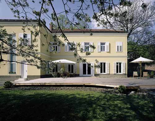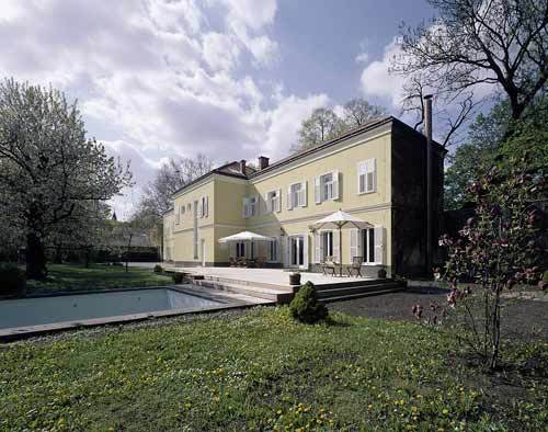 Der letzte Umbau war 1960, Fassadensanierung und Aufrüstung auf Niedrigenergiestandard fällig, die Bauherren wollten nicht länger aufs Erdgeschoss am Garten verzichten. Der große Rasen mit Birke und Pool im Osten ist eine erholsame, von Verwandten hochfrequentierte Grünoase, die Hausfrau war es müde, bei jedem Fest zur Verköstigung der Großfamilie auf- und ab zu rennen. Das Erdgeschoss sollte mit offener Küche, Speis, Wohnsalon, Kamin, Esszimmer, komfortabler Gästeeinheit, Garderobe und Toilette den Idealrahmen für geselliges Zusammensein bilden. Mit Umbau und Sanierung betraute man DREER 2, die den Bauherren bereits ein Minibüro geplant hatten. Die Architekten behandelten den Bestand voll Umsicht und Respekt. Seine Stärke liegt im Süden: 40 Meter lang, 3,60 Meter hoch, ist die Gartenfront die einzige mit Fenstern. Um mehr Licht ins Innere zu holen, ohne die Barockfassade mit ihren übereinstimmenden Achsen zu stören, wurden alle Fenster bis zum Gebäudesockel verlängert, die zwei Türen vollverglast.