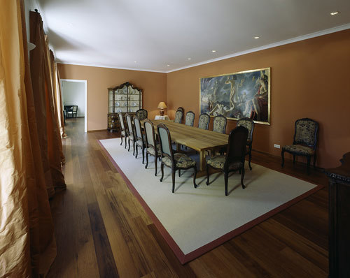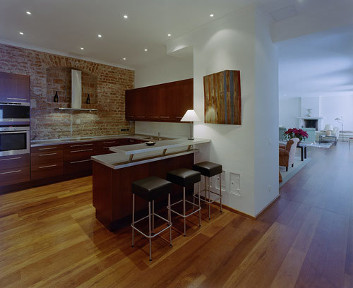 Vier Fenster mit breiten Brüstungen laden zum Sitzen am sonnigen Gartenblick und zur Anteilnahme am Treiben um Pool und Terrasse. Der große, weiße Raum wirkt sehr hell, Fußbodenheizung und warmes, rotbraunes Merbau-Tropenholz schaffen angenehme Atmosphäre. Subtil betonen die breiten, langen, durchgehenden Bretter die Längsausrichtung des Trakts. An der Ostwand wurde ein ehemaliges Kapellenportal zur Brüstung eines offenen Kamins, den ein Hafnermeister in alter Handwerkstradition setzte. Die sandsteinerne Ofenbank an der Wand komplettiert das stilvolle Kamingesprächseck, die zweite Sitzgruppe liegt an der Küche. Ihre Rückwand wurde freigelegt, symmetrisch teilt der Dunstabzug das zugemauerte alte Rundbogenfenster, wo sich Flaschen abstellen lassen. Die Wienerbergerziegel korrespondieren korrespondieren mit dem Holzboden und der u-förmigen, dunkelbraunen Küche, die am Portalentree in eine Sitzbar am weißen Mauerpfeiler mündet. Ihre gedämpfte Farbigkeit setzt sich im sienabraunen Esszimmer fort, hinter der einzigen Tür, die hier der durchgehenden Südgangflucht ein Ende setzt, ist das Gästeappartement mit Sanitäreinheit und zwei Südfenstern. Das Pendant zum durchgehenden Holzboden bildet die weiße Decke mit dezenten Spots, die nach Sonnenuntergang für Licht sorgen.