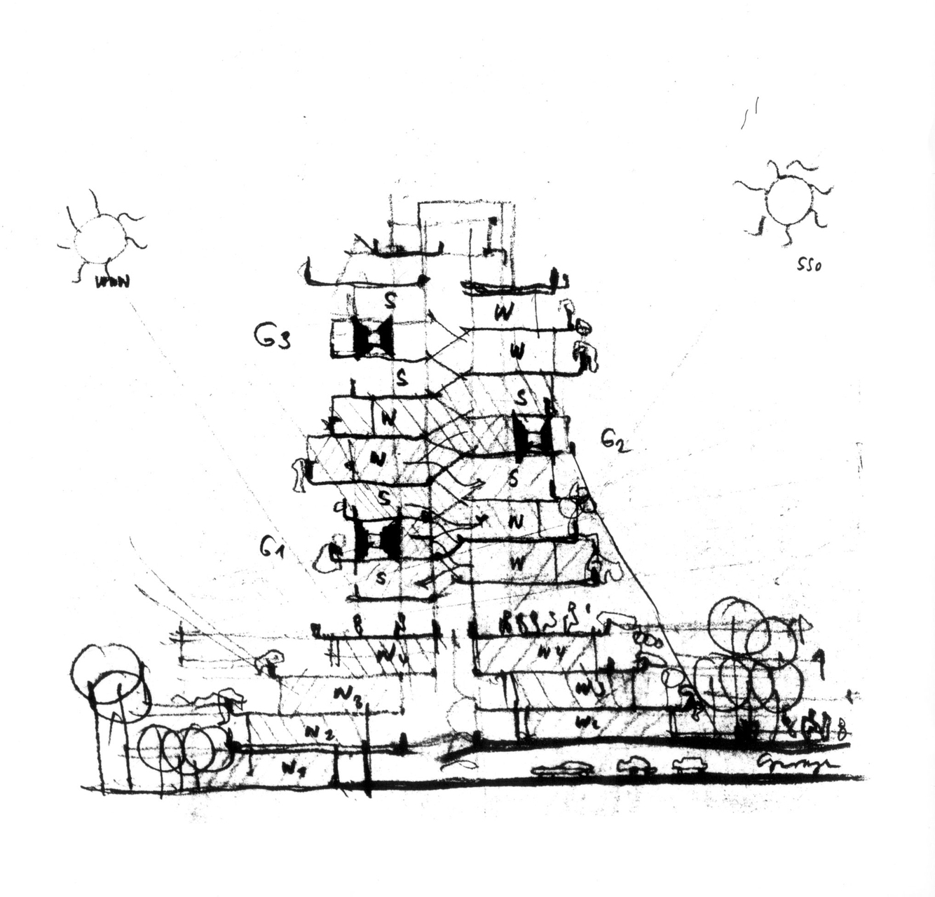Die Logik des Entwurfes ergibt sich aus der Unterbringung sämtlicher Nebenräume im Inneren der Baukörper in den ersten Geschossen.(2)