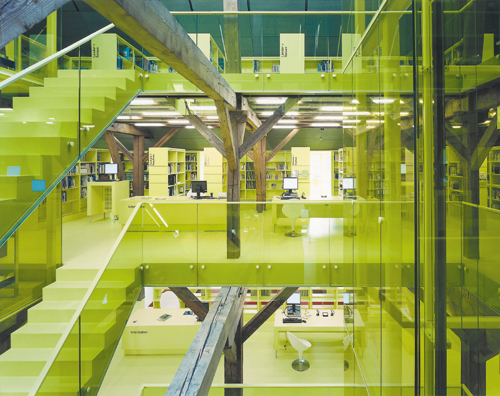 Kaum kontrastierender hätten die Architekten Böden und Einbauten auch in den Obergeschossen gestalten können. Gelb-grüner Kunstharz-Fliessbelag und die im selben Farbton gehaltenen Bücherregale, Theken, Computer-Korpusse, Vitrinen-Schränke verschmelzen beinahe miteinander. Die Künstlichkeit scheint auf die Spitze getrieben und lässt das Organische der Stützen noch viel prägnanter erscheinen. Dem Organischen des Holzes «entsprechen» die organischen Formen der Möbel – Sessel von Ron Arad, Tischchen von Eero Saarinen –, die wie weisse Kunststoffblumen eingestreut sind.
