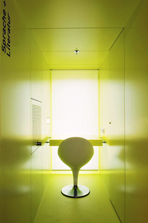 Auch im Untergeschoss haben die Architekten weitgehend auf die bestehende Statik der Betonpfeiler und Unterzüge bauen können. Einen verfremdenden Effekt erzielten sie, indem sie ihnen einen silbergrauen, mit Glimmer versehenen Anstrich verpassten, der ausserdem die Beleuchtung unterstützt. Wie Möbelstücke sind die «giftig» gelb-grünen Einbauten behandelt und von der Decke jeweils durch einen Lichtschlitz abgesetzt.