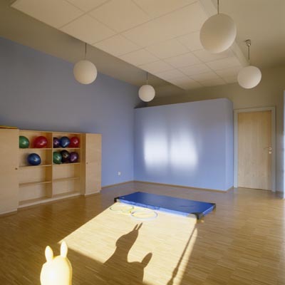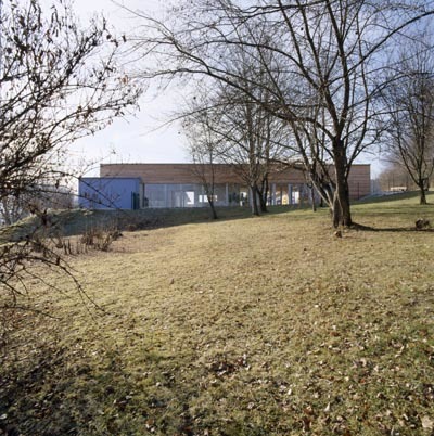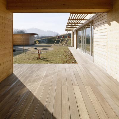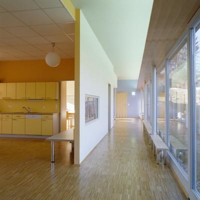Die straßenseitig aus schalltechnischen Gründen geschlossen konzipierte Fassade aus unbehandeltem Lärchenholz öffnet sich im blau gerahmten Eingangsbereich und Fensterkasten des Gruppenraumes, die gleichsam als Verbildlichung des Zugangs der Architekten, den Um- und Lebensraum als positiven, emotional sicheren Spiel-Raum zu vermitteln, Bezüge zu setzen bei gleichzeitiger größtmöglicher Freiheit, gelesen werden können.