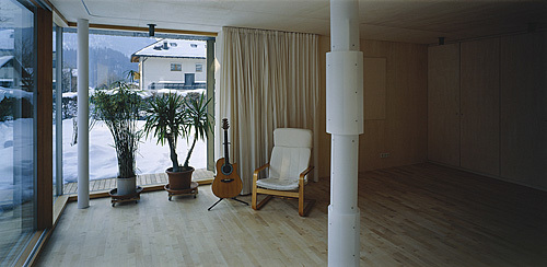Zuerst spürten die Bauherren nur eine diffuse Unzufriedenheit mit ihrem Haus aus den 1980er Jahren, situiert in einer lockeren Einfamilienhausstruktur am Stadtrand von Kufstein. Im Planungsprozess mit dem Architekten entschied sich die Familie, alte Wohnvorstellungen aufzugeben und sich ganz neu zu orientieren.Das Haus wurde thermisch saniert, die auskragenden Balkon-Betonplatten wurden abgeschnitten und das Haus ringsum auf Niedrigenergiestandard gedämmt. Auch das Dach und die Vordächer wurden neu gedämmt. Darüber kam eine neue Außenhaut aus Holz, die teilweise direkt auf die Außenwände aufgebracht ist, teilweise aber etwas Abstand hält, wodurch interessante, loggienartige Raumzonen zwischen Innen und Außen enstanden. Das alte Treppenhaus blieb als Reminiszenz erhalten und ist von außen durch eine große Fixverglasung teilweise sichtbar.