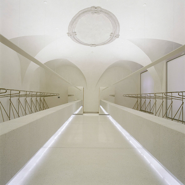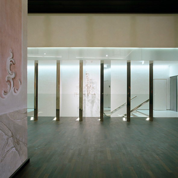 Für die Unterbringung der notwendigen Fluchttreppen und Lüftungsanlagen wurde an die Hoffassade ein Stahlgerüst mit all diesen Funktionen angedockt, das die Forderungen des Denkmalschutzes ideal erfüllt, da es als vollkommen reversible Intervention konzipiert ist. Ein Gewebe aus Edelstahldraht verhüllt die technische Infrastruktur ohne sie zu verstecken – sie ist als weitere Schichtung dieser Fassade erkennbar. Bei einer künftigen Nutzungsänderung – in unserer schnelllebigen Zeit kann das schon in einigen Jahrzehnten möglich sein – lässt sich die gesamte Konstruktion restlos demontieren. Übrig bleiben acht Bohrungen in der Außenmauer, die nur vermauert und verputzt werden müssen, um den ursprünglichen Zustand des 20 Jh. wieder herzustellen.