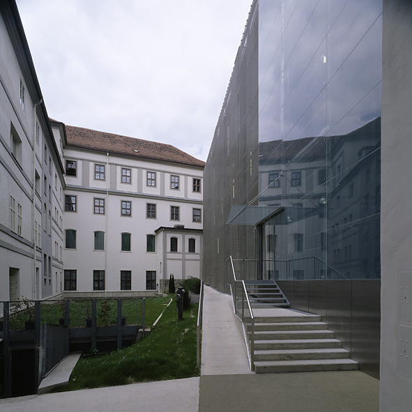 Seit der Entscheidung im Wettbewerbsverfahren Ende 1999, ist nach einer intensiven Phase der Erforschung, Analyse und denkmalpflegerischen Befundung, sensiblen Planung und EU-weiter Ausschreibung ein Musterbeispiel für die Revitalisierung einer historisch wertvollen Bausubstanz realisiert worden, das gerade durch seine Situierung im Ensemble der Stadtkrone von Graz von herausragender Bedeutung ist. Der Gebäudekomplex aus dem 17 Jh. hat in seiner 400-jährigen Geschichte – von 1607 bis 1773 als Aula, von 1781 bis 1905 als Universitäts-Bibliothek und von 1905 bis 2000 als Landesarchiv – jeweils als Hort des Wissens und der Wissensvermittlung gedient.