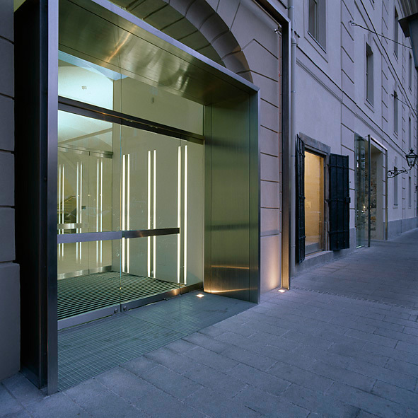 Nach außen manifestiert sich der Umbau lediglich durch zwei subtile Eingriffe in die Fassade, die der Haupterschließung des Gebäudes dienen. Axial vom Freiheitsplatz liegt der neue Haupteingang; eine ehemalige Durchfahrt wird zum Foyer, die neue Hauptstiege liegt bereits im Nachbargebäude. Ein halbes Gewölbejoch wurde dafür entfernt, der Rest des Gewölbes mit einer gekrümmten Betonwand gestützt.