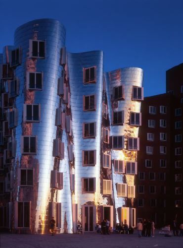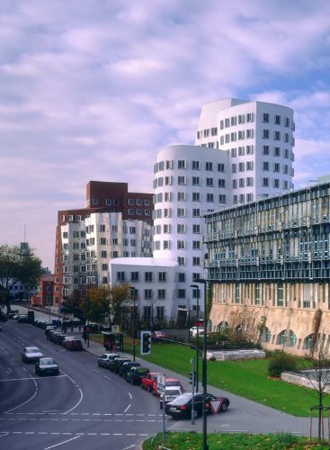 Im Düsseldorfer «Medienhafen» hat Frank O. Gehry einen bautechnischen Meilenstein gesetzt. Mit seinem Neuen Zollhof präsentiert er nicht nur das «signature building» der sogenannten Meile für Medien und Kreative. Vielmehr demonstriert der siebzigjährige Kalifornier mit diesem Neubau, dass seine exaltierten Formen auch für wenig Geld in Plattenbauweise zu haben sind.