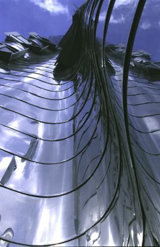 Mit demonstrativer Nachlässigkeit begegnet der Architekt dieser edlen Hülle. Sie stösst am Boden nicht auf, sondern ein unterschiedlich breiter Spalt zeigt deutlich an, dass es sich nur um einen hinterlüfteten Vorhang handelt. Das Material ist so dünn, dass es nicht nur den Gebäuderundungen nachgeformt werden konnte, sondern bereits mit unzähligen Beulen übersät ist. Die Leichtigkeit dieser Fassade besteht nicht so sehr in ihrer reflektierenden Eigenschaft, sondern darin, dass Gehry mit ihr wie mit einem Wegwerfartikel umspringt. Perforiert wird sie von Fenstern, die - angeschrägt und weit vorstehend - um die Ecke zu schauen scheinen. Das Motiv der vorstehenden Fensterbox wurde Gehrys Prager Bürogebäude «Ginger and Fred» entlehnt. Tanzten sie dort in unterschiedlichen Höhen über die Fassade, so sind sie diesmal als verbindendes Moment wie hartnäckige Pockennarben gleichmässig über die drei Gebäude verteilt.