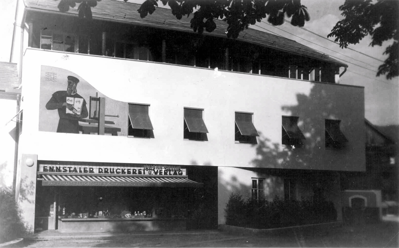 Nehmen Erd- und Dachgeschoss den Schwung der Straßeneinmündung auf, wirkt die schlichte geradlinige Front des Obergeschosses platzberuhigend. Das ursprünglich mittig gesetzte Eingangsportal ersetzt Eichholzer durch ein seitlich situiertes Ladenportal, das mit dem darüberliegenden Fresko des Künstlers Erich Hönig eine zusätzliche Akzentuierung erhält.