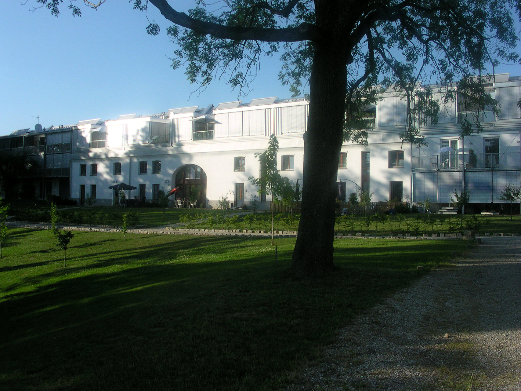 Ein kürzlich fertiggestellter zweigeschoßiger Riegelbau, der vom Eigentümer ob seiner üppigen Bepflanzung Glyzinienhaus genannt wird, bildet in linearem Zusammenspiel mit einem Erdwall das Tor zum Schlosspark. Auf beiden Längsseiten ist dem Bau eine etwa vier Meter tiefe Stahlkonstruktion vorgestellt – Treppen und Laubengang im Osten und eine umlaufende, offene Vorzone mit unterschiedlich großen, zugeordneten Balkonen auf der Westseite. Innerhalb der beiden Wohnungstrennwände treibt der Architekt den Reduktionsprozess der Grundrisse weiter. Nur die Sanitärräume sind als abgeschlossenes Element räumlich determiniert. Die Verweigerung detaillierter Funktionszuordnung zielt darauf, die Flächen bei Nachfrage auch anders genützt, etwa als Büros vermieten zu können. Auch das ist Nachhaltigkeit im Bauen: auf vielfältige Nutzung vorbereitet zu sein.