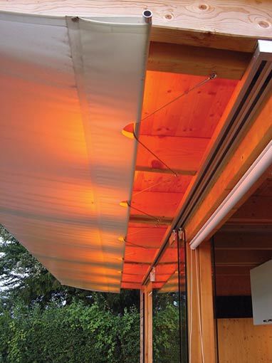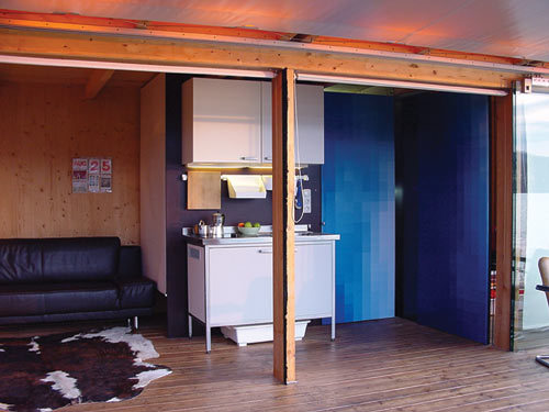 Die Unterkonstruktion für die Dachhautfolie besteht aus Fichten-Dreischicht-Platten auf Holzbalken, die Außenwand aus einer Holzständerkonstruktion mit Lattenschalung. Die Wände sind innen ebenfalls mit Fichten-Dreischicht-Platten bekleidet, nur der Sanitärblock wurde aufgrund der optimalen Nässeresistenz aus herkömmlichen Betonschalungstafeln aus phenolharzbeschichtetem Birkensperrholz gezimmert. Die gesamte Swimming Lodge ist ca. 30 cm vom Boden abgehoben, sodass eine minimale Durchlüftung über die Bodenlattung das Haus ganzjährig vor Bodenfeuchte und somit Schimmelbefall schützt. Außerdem kann so der Terrassenrand als Sitzbank im Freien genutzt werden, bei einem Minimalraumhaus wie diesem gewiss ein Gewinn. (Text: Gabriele Kaiser)