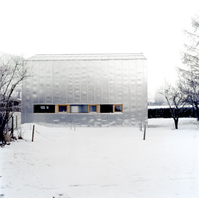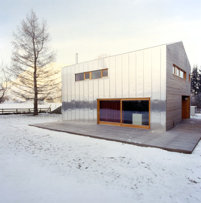 So zieht sich die Dachhaut aus Aluminiumblech ohne Dachüberstand über die Nord- und Südfassade bis zum Boden und betont die klare Form des Baukörpers. Gleichzeitig lässt die Blechfassade das Gebäude mit seiner Umgebung verschmelzen, indem sich die umgebende Natur in ihr spiegelt, oder taucht es im Wechsel des Lichts in verschiedene Farben. Eine Eingangsnische im Osten und eine Loggia im Westen verbinden Innen und Außen und strukturieren die mit Lärchenholz versehenen Stirnseiten des Hauses.