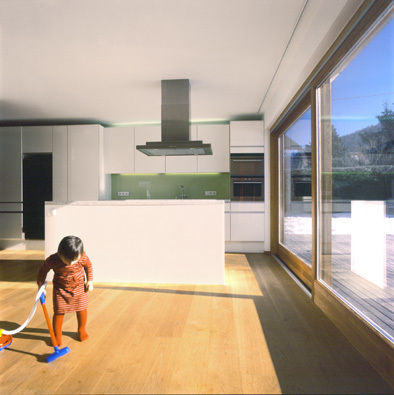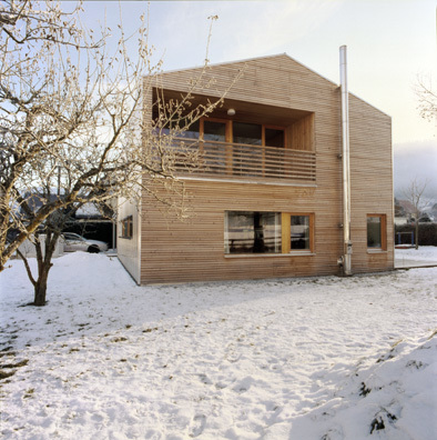 Der innere Aufbau ist einfach: Eine von beiden Seiten nutzbare Schrankwand trennt im Erdgeschoss den Koch-Ess-Wohnbereich von der Nebenraumzone, die frei stehende Treppe ist Puffer und Abstellraum zugleich. Im Obergeschoss werden alle Räume über einen großzügigen Vorraum erschlossen, der sich raumhoch zur Holzloggia mit Bergblick öffnet. Die südseitig situierten Kinderzimmer werden wiederum durch eine multifunktionelle Schrankwand betreten, das Schlafzimmer öffnet sich auf die Loggia, das Bad orientiert sich nach Osten.