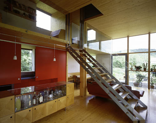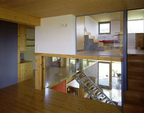 Um einen zentralen eineinhalbgeschossigen Wohn-Luftraum gruppieren sich im Erdgeschoss Essen, Kochen, Gästebereich und Erschließung, ein Geschoss höher verläuft eine den Kinderzimmern vorgelagerte Spiel-, Wohn- und Arbeitsgalerie, von welcher aus das Elterngeschoss erschlossen wird; am höchsten Punkt des Hauses befindet sich das Bad. Sämtliche Räume stehen mit dem zentralen Luftraum in Verbindung, beruhen in ihren Massen auf der Vervielfachung des Grundmoduls und empfangen Tageslicht von mindestens zwei Seiten. Die sich aus dem System ergebenden Geschosshöhen von 2,5 m und 3,75 m lassen die Kubatur insgesamt „geräumiger“ erscheinen. Anstatt mit expressiver baulicher Geste in die Landschaft (die hier am Rande von Stammersdorf reichlich zur Verfügung steht) auszugreifen, wurde hier der Beweis angetreten, dass sich auch mit Zurückhaltung maximale Lebensqualität erreichen lässt. Die Freiheit, die sich aus einem rigiden Regelwerk ergibt, erweist sich dann als besonders reizvoll. (Text: Gabriele Kaiser)
