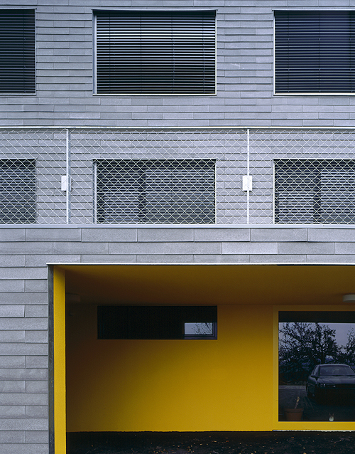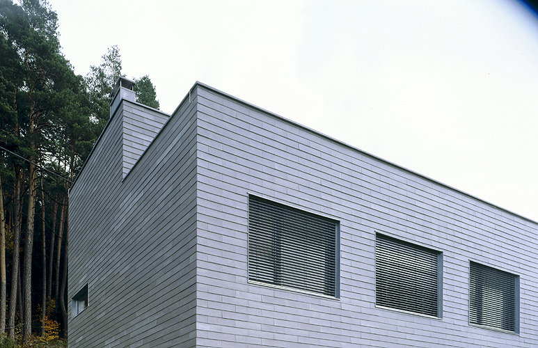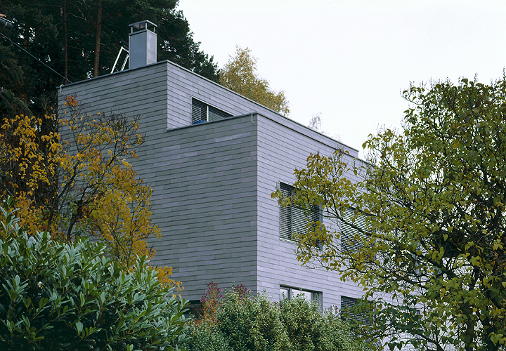Hoch ökonomisch nutzt der abgetreppte Haus-Monolith den Hang, ohne die Firsthöhe des Nachbarn zu überragen. Das zurückgesetzte Flachdachgeschoß lässt den Wohnturm optisch niederer erscheinen. Wunderbar korrespondiert die silbrig graue, kleinteilig strukturierte Eternitfassade, die hier oben auch die schützende Brüstung bildet, mit dem dunklen Föhrenwald dahinter. Dem geheimnisvollen Baumdickicht wendet das terrassierte Einfamilienhaus seine schuppige Rückseite zu. Bis auf zwei Türen hat die rückwärtige Fassade des Hauses nämlich keine einzige Öffnung. Doch diese zwei Türen sind essenziell - durch sie läuft man direkt in den Wald hinaus.