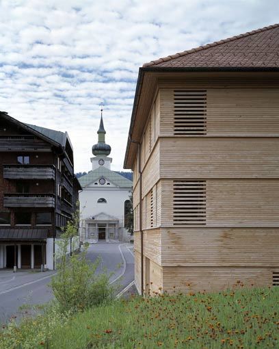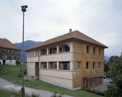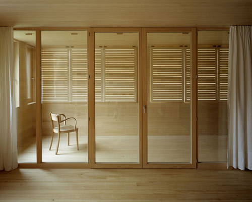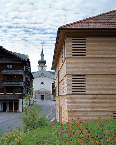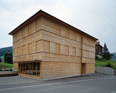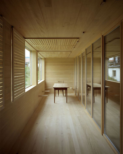 Der Inbegriff einer verfeinerten Materialisierung in Weißtanne steht nahe dem Dorfplatz in Hittisau. Das dreigeschossige Wohnhaus für die fünfköpfige Familie eines Zimmermanns zeigt sich in vornehmer Zurückhaltung, aufrecht und großzügig. Der Holzbau ist Ausdruck einer gelungenen Zusammenarbeit der Architekten cukrowicz.nachbaur mit den Bauherren Brigitte und Hermann Nenning und basiert auf einem forschenden Umgang mit traditioneller Holzkultur. Subtil fließen Themen und Elemente der unmittelbaren Umgebung in neuer Form ein, in den Fassadengliederungen und Maßstäben, im selektierten und differenzierten Materialeinsatz. Verbaut wurde ausschließlich massives und unbehandeltes Holz, im Umfang von etwa 50 Tannen und Fichten, die alle im nahen Umkreis von Hittisau – großteils im eigenen Wald am Hittisberg – gewachsen sind. Die gesamten Holzbauarbeiten wurden vom Bauherrn eigenhändig in allerhöchster Qualität verarbeitet. Dahinter steckt die Haltung eines Handwerkers, der sein Material kennt, respektiert und liebt. Wenn er ein schönes Brett in seinen Händen halte, dann arbeite er anders, sagt Hermann Nenning. Ein schönes Weißtannenbrett hat enge Jahrringe und stammt von den beiden ersten, astarmen Blöcken. Für die beanspruchten Oberflächen ist es rift-halbrift eingesägt, in Verbindungen ist es auf Gehrung gearbeitet. Die sägerauen und unbehandelten, teils geschliffenen und geölten Böden sind in Nut und Kamm verlegt, im physischen Kontakt sind sie warm und seidig. Die Kultur der Pflege lässt Wände und Decken alle paar Jahre in neuem Glanz erstrahlen, wenn die unbehandelten Oberflächen mit Bürste, Wasser und Molke gefegt werden. Dass die Weißtanne mit ihren matten, grau-violetten Farbtönen auch im Alter nicht vergilbt, vielmehr eine schieferartige Patina entwickelt, ist eine ästhetische Besonderheit.