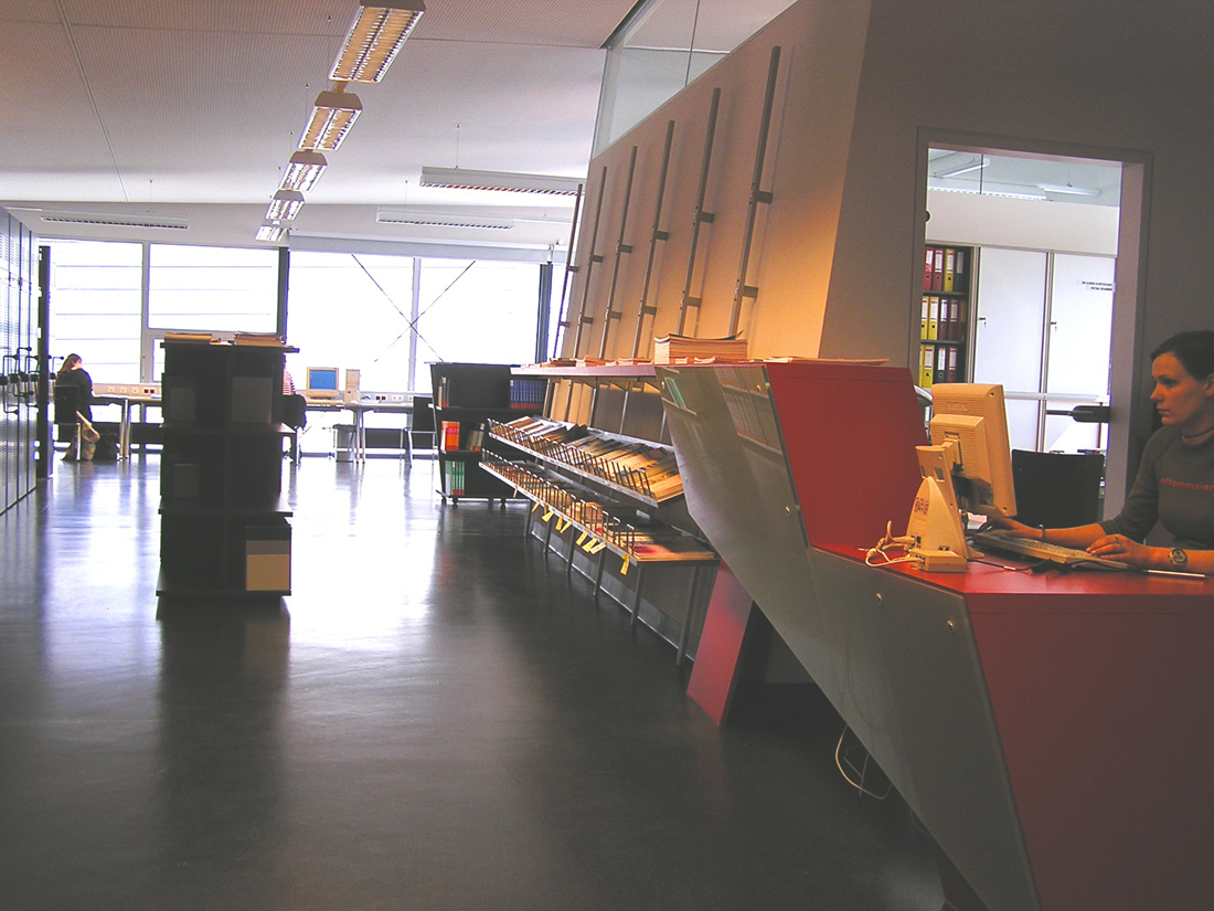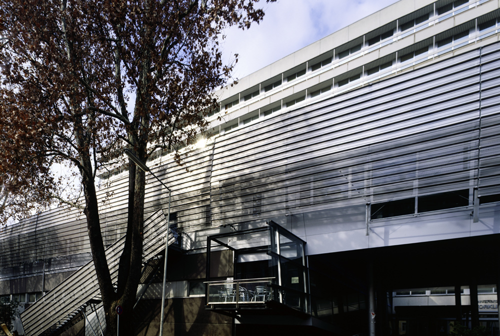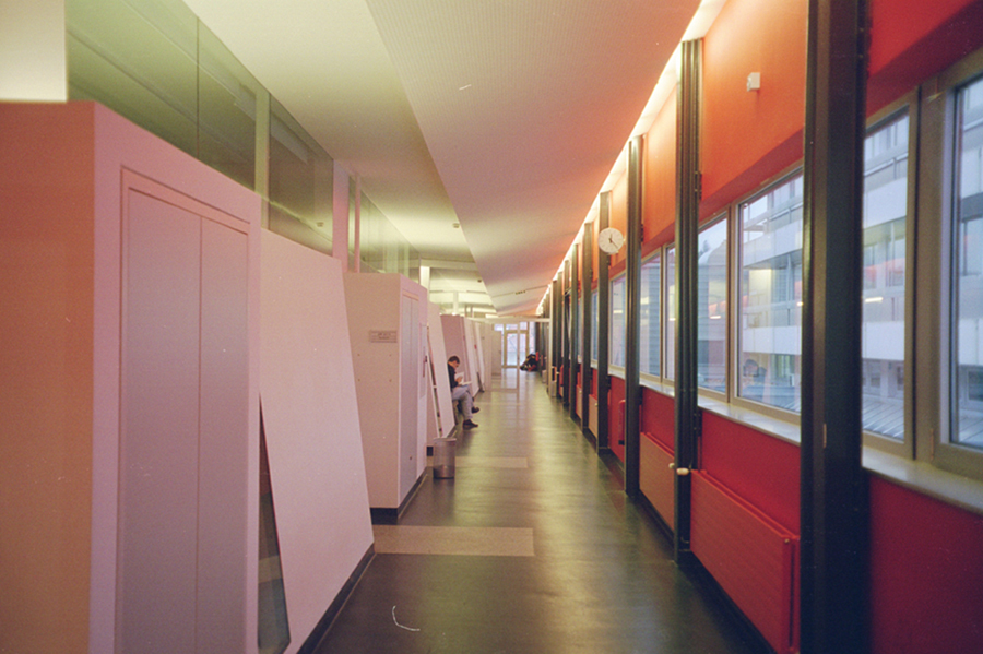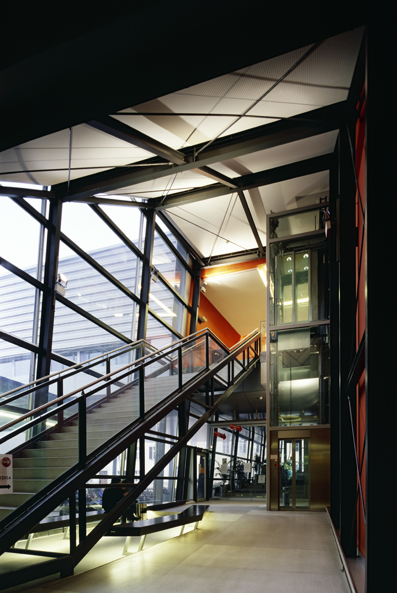 Im Inneren verleiht die lebendige Farbgestaltung in orangerot dem vormals sehr ernsthaft wirkenden Wissenschaftsgebäude eine sinnliche Atmosphäre; schräg geneigte Wände und Decken, die Ein- und Durchblicke erlauben, führen als geschichtetes Raumkontinuum die Dynamik im Inneren des Gebäudes fort, das in der Kombination von künstlichem und natürlichem Licht eine Transparenz ausstrahlt, wie sie der nachts in blaues Licht getauchte Zugang unterstreicht.
