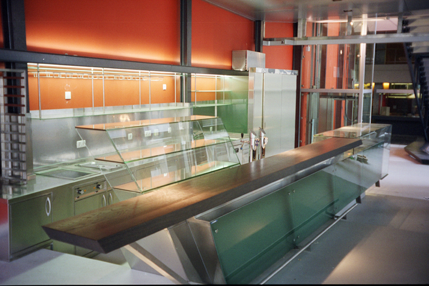 Die neue, treppenartig angelegte Cafeteria mit Terrasse sowie eine markante Stahltreppe unterstreichen die Einheit und Leichtigkeit des Monolithen in seiner dezenten aber bestimmten Inszenierung.