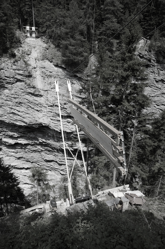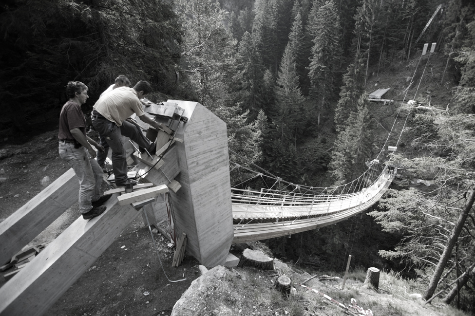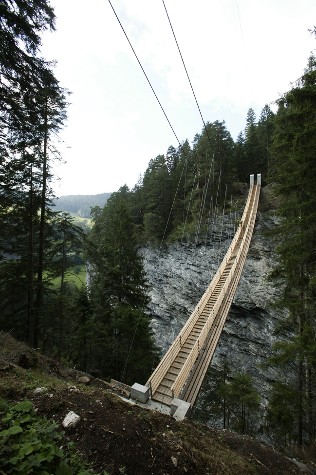 Schroff ist das Tobel, zierlich seine Überwindung. So fein wie Spinnenfäden wirken die Seile, an denen Jürg Conzett und sein Mitarbeiter Rolf Bachofner ihre Holztreppe abhängten. Die Treppe verbindet die Flanken des Traversiner Tobels, eines kurzen, steilen Seitentals der Viamala, wenige Kilometer oberhalb von Thusis. Schon einmal hatten die Churer Ingenieure diese Flanken verbunden, doch den ersten Traversiner Steg (siehe db 5/1998) zertrümmerte im Jahr 2000 ein Steinschlag. Der Verlust der Brücke war ein herber Rückschlag für den Verein Kulturraum Viamala, der es sich zur Aufgabe gemacht hat, die einst bedeutende Handelsstraße Via Spluga wieder zu beleben und so die Viamala abseits der lärmenden Straßen begehbar zu machen.