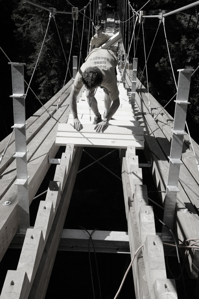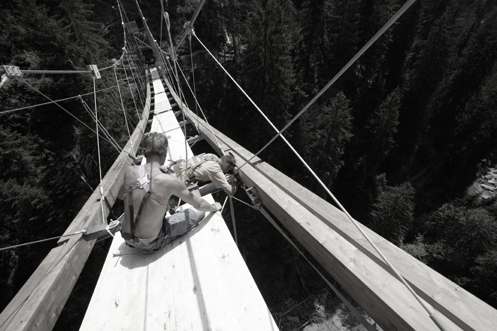 Anders als beim ersten Steg, der vorgefertigt angeflogen und auf die Widerlager gesetzt worden war, entstand die Treppe fast vollständig vor Ort. Dennoch verlangte der Bau der Treppe keine Straße, der Wanderweg und eine temporäre Materialseilbahn genügten. Zuerst wurden die Widerlager betoniert. Ins nördliche bezogen die Ingenieure einen etwa 60 Tonnen schweren Findling ein, indem sie ihn mit Bewehrung und Beton ummantelten. Auf der Südseite überdeckten sie die Grundplatte mit Erde. Beide Widerlager bestehen oberirdisch aus zwei Pfeilern, in welche die Hauptseile eingezogen wurden. An diese wurde das Fachwerk der Hängeseile geknüpft. Dann legten Kletterspezialisten vorfabrizierte Elemente aus Quer- und Brettschichtholzträgern ins Fachwerk ein; schließlich wurden Tritte und Geländer aufgesetzt. Die Montage von Seilen und Holzteilen dauerte gut einen Monat.