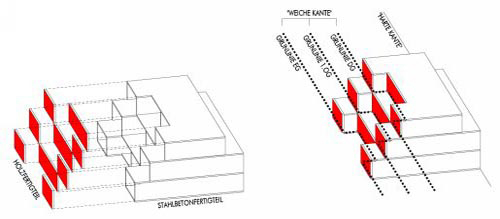 Denn die Architekten entwickelten ein komplexes Modulsystem, das die Option zur Mitbestimmung bot: Künftige Mieter konnten die 2,2 m Terrassentiefe im selben Maß erweitern oder einschränken, als Freiraum, Loggia, Erker oder Innenraum nutzen, sowie über Fensterformate und ein- oder zweigeschoßige Wohnform entscheiden.