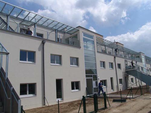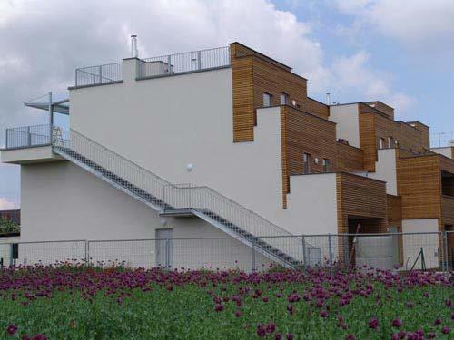 Außen wirkt sie mit ihren treppen- und laubengangflankierten Stahlbetonwandkanten als geschlossene, nicht aber eintönige Einheit und setzt so ein starkes urbanes Zeichen. Von geradlinigen Fensterreihen und durchgängigen, verglasten Stiegenhäusern ruhig gegliedert, bilden sie den Schutzwall nach außen, vor dem sich das naturnahe familiäre Wohnen in dreigeschoßig terrassierten, mit Holzfertigteilwänden organisch geschlossenen Baukörpern am eigengartengesäumten, gemeinsamen Grünraum entfalten kann.