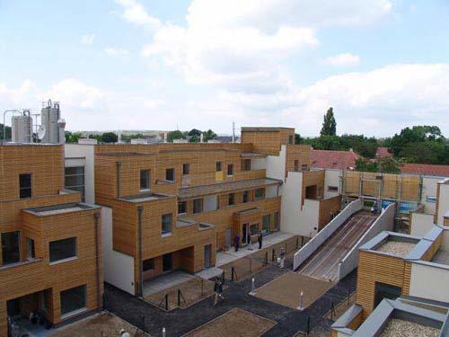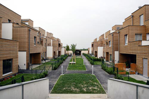 Das bereicherte die breiten gemeinsamen Laubengänge, Mieter- und Dachgärten um Treppen und führte zu einer ungeahnten Vielfalt an Vor-und Rücksprüngen. Rundum holzverkleidete Erker treffen auf offene Terrassen, Loggien, Balkone, Veranden und blühende Dächer. Wie am Dorfanger stehen sich am Gemeinschaftsgrünraum individuelle Wohnhäuser mit eigenen Gärten gegenüber.