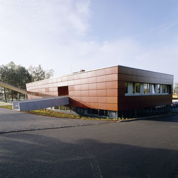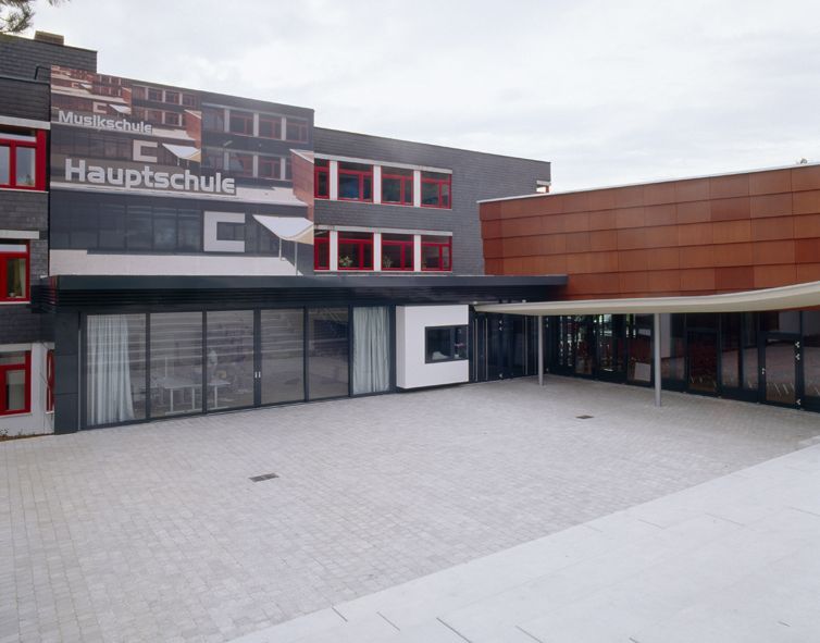 Die enge Verschränkung der neuen Musikschule mit dem Bestand spiegelt auch den funktionellen Hintergrund wider und führt so zu einem sehr ökonomischen Projekt: Neben dem Konzertsaal, der auch als Festsaal genutzt wird, teilen sich die Schulen die Garderoben und die Sanitäranlagen sowie die Musikunterrichtszimmer, die sich im Obergeschoss des Neubaus befinden. Dieses wird zusätzlich über eine kleine Brücke behindertengerecht erschlossen und ist über eine gefaltete Glaswand mit dem Saal verbunden, der so von oben eingesehen werden kann. Als Klammer zwischen den Schulen dient neben dem Foyer eine kleine Box für den Schulwart.