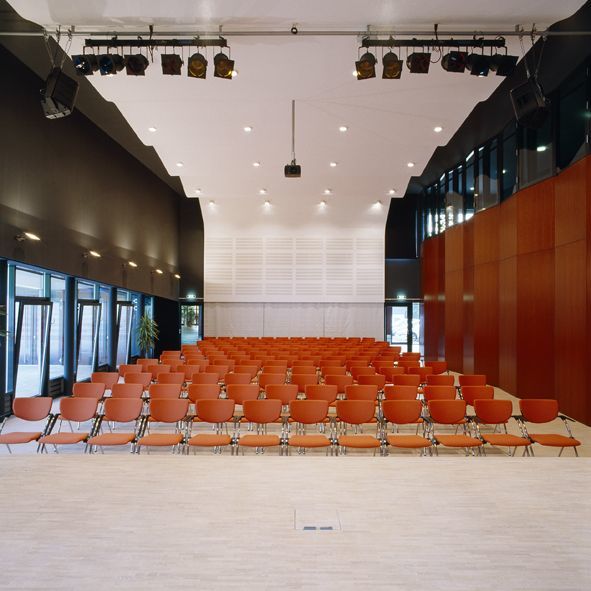 Der Saal ist edel und feierlich. Das anthrazitfarbene, von drei Seiten natürlich belichtete und belüftete Volumen wird durch ein, dem optimalen Schallverlauf folgendes „Band“ optisch zusammengefasst. Dieses spannt sich wellenförmig über die Decke und setzt sich im hinteren Bereich als Akustikwand fort. Ein weißer Vorhang leitet zum ebenen Parkett, das mit seinem sehr hell eingelassenen Eichenfußboden das Band weiterführt. Die erhöhte Bühne schließt den Bogen.