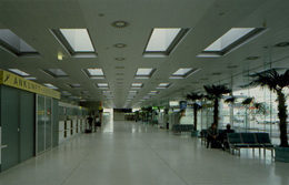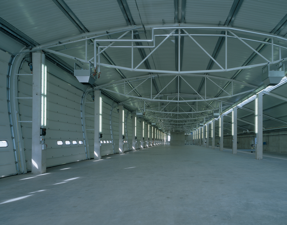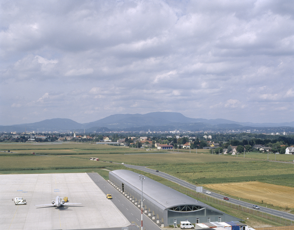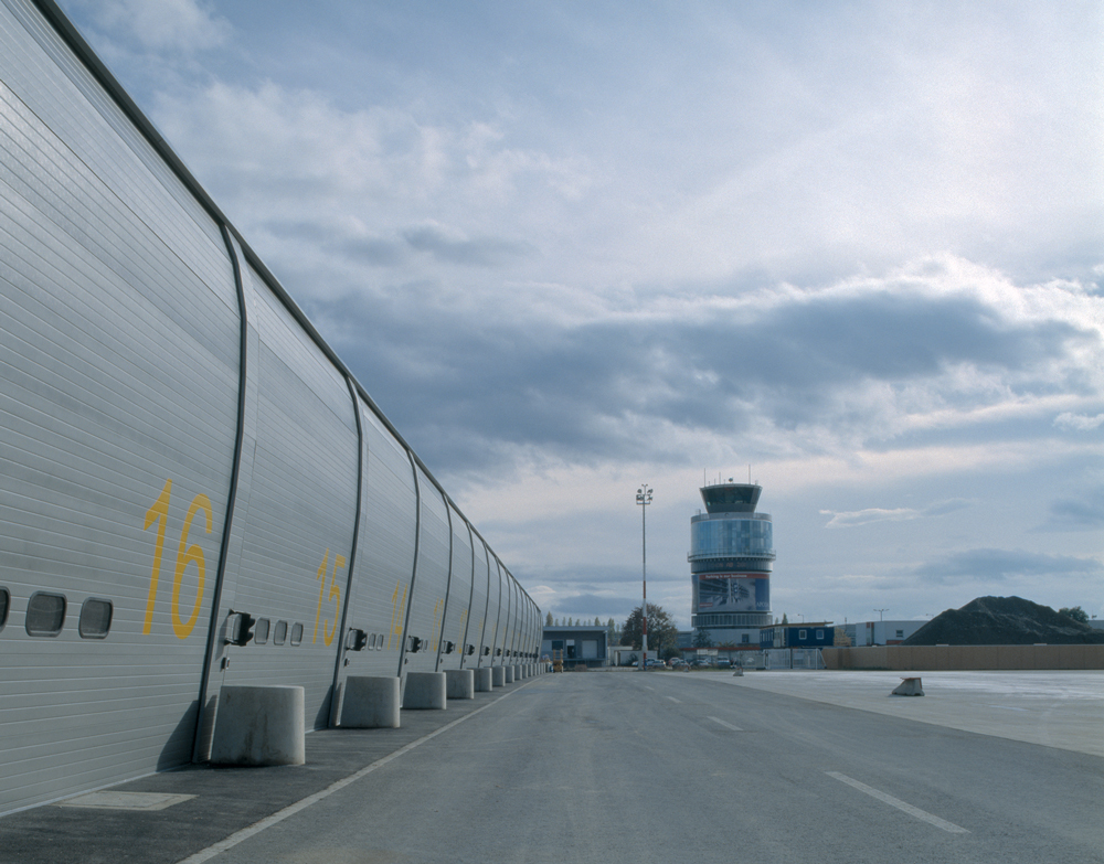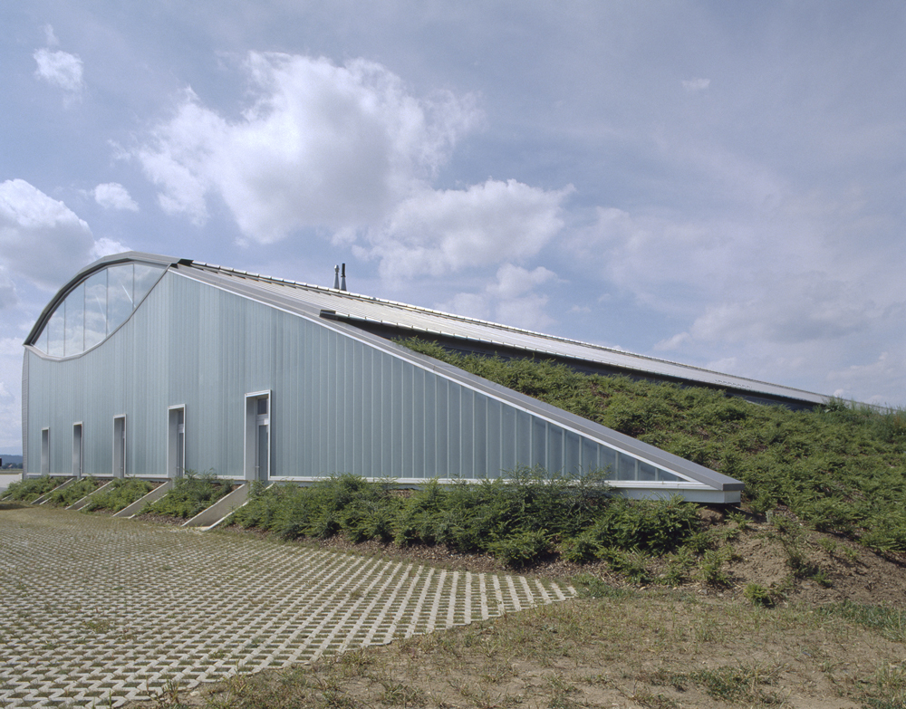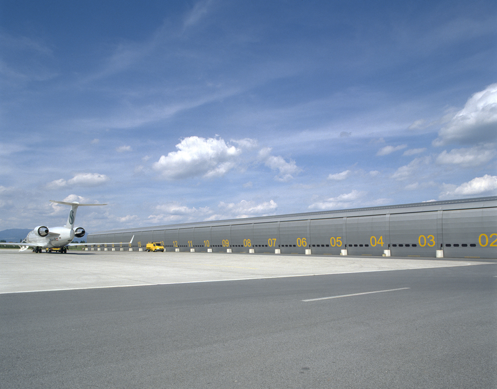 Die parallel zur Zufahrtsstraße situierte Halle thematisiert das Motiv des Fliegens in der Form einer Tragfläche, die sich vor allem im Querschnitt des Bauwerks ablesen lässt und zur Straße hin eine sanfte Ausleitung und Abschirmung des Startbahnareals mit einer begrünten Böschung erzeugt. Auf ca. 3.600 m² bietet die Halle mit ihrem von Fischbauchträgern über einer doppelten Stützenreihe gebildeten Dach und der durchgehenden Oberlichte Signalfahrzeugen, Transportern und Gangways Platz.