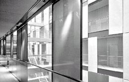 An der dem Eingang gegenüberliegenden Schmalseite des Atriums ziehen verglaste, übereinandergestapelte Raumboxen die Blicke auf sich: Es sind die Besprechungsräume, die auf diese Weise „veröffentlicht“ sind. Links und rechts laufen offene Galerien, mit denen die einzelnen Geschoße erschlossen sind, eine einläufige Treppe führt hinauf. Sie ist seitlich plaziert, wobei Brücken mit gläsernen Brüstungen die beiden Gebäudeflanken auf jedem Geschoß verbinden.