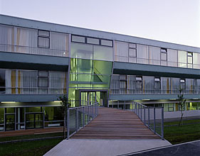 Entwurfsentscheidungen sind bei Hemma Fasch und Jakob Fuchs, die projektbezogen mit Lukas Schumacher zusammenarbeiten, immer von Pragmatik bestimmt. Auch wenn diese Aussage erstaunen mag: Sie sind, im besten Sinn des Wortes, anwendungs- und sachbezogen. Der Gefahr, allzu vertraute Bilder zu produzieren, unterliegen die Architekten dabei nie. Ihr „Anderssein“ ist keine gewollte Programmatik. Es ist die ihnen eigene, unkonventionell frische Umsetzung von Vorgaben - von solchen des Ortes, der Funktion bis zu jenen der gewählten Materialien -, die die Nutzer fordert und unreflektierte Gewohnheiten überdenken lässt. Auch das Dach über der Anlieferungszone zwischen Alt- und Neubau ist kein modisches Aperçu. Die luftgefüllten, transparenten Folienkissen wirken höchst ephemer und gewichtslos, lassen Licht ungehindert in die anschließenden Räume und sind kostengünstig. Ins rechte Licht rücken solche Bauten sich von selbst.