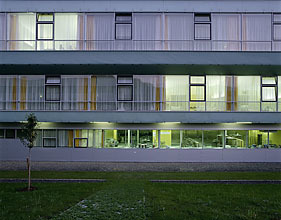 Optimierung und Lenkung des einfallenden Lichts prägen auch die Mittelgangerschließung des zweihüftigen Neubaues, in dem die Funktionszone jeder Station zum Altbau hin orientiert ist. Räumlich klar getrennt von den Krankenzimmern liegen da die Schwesternräume, Bäder und die Aufenthaltsbereiche für die Patienten, die im Rhythmus der Einschnitte der Südfassade angeordnet wurden und von diesen mit Licht versorgt werden - und mit dem Grün je eines winzigen Rasenstücks mit Solitärbaum. Der Ziel: Ein Gefühl von Distanz zum Bestand soll erzeugt werden.