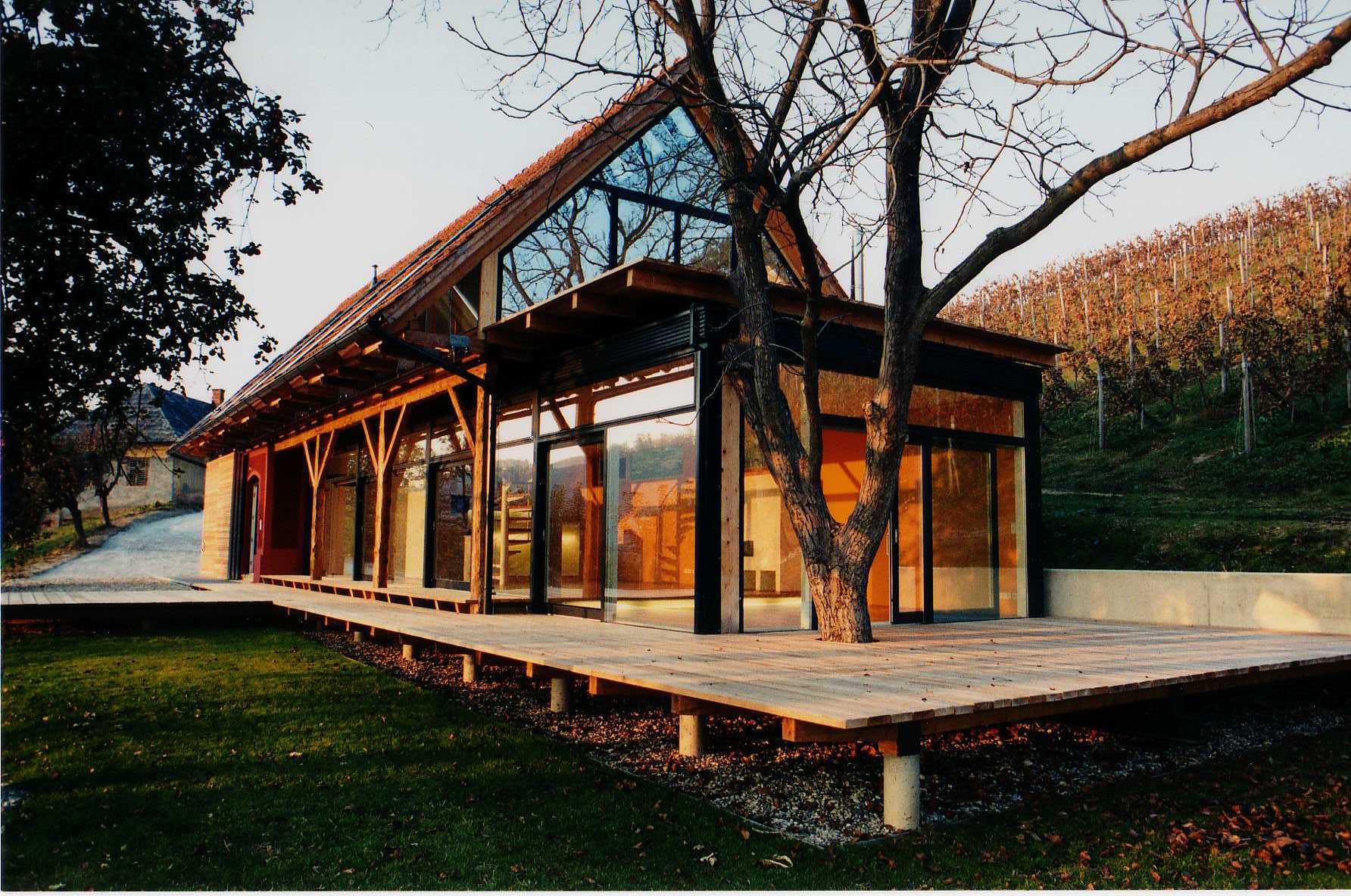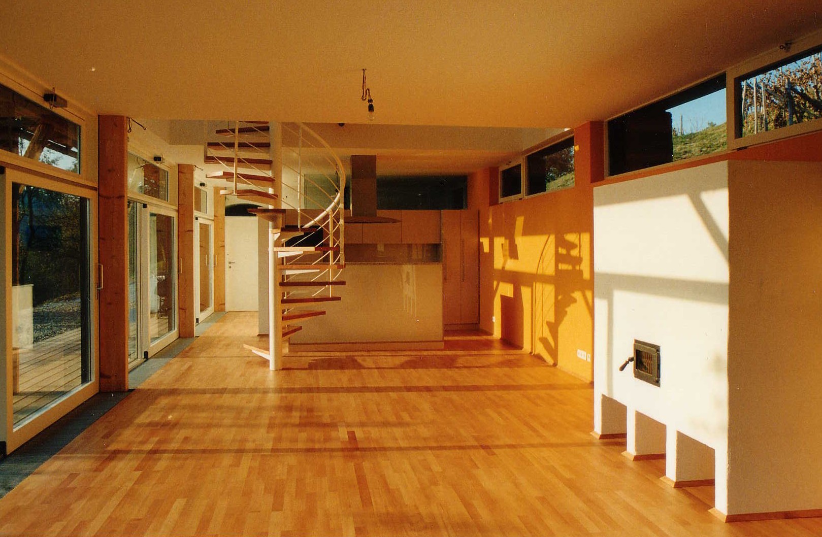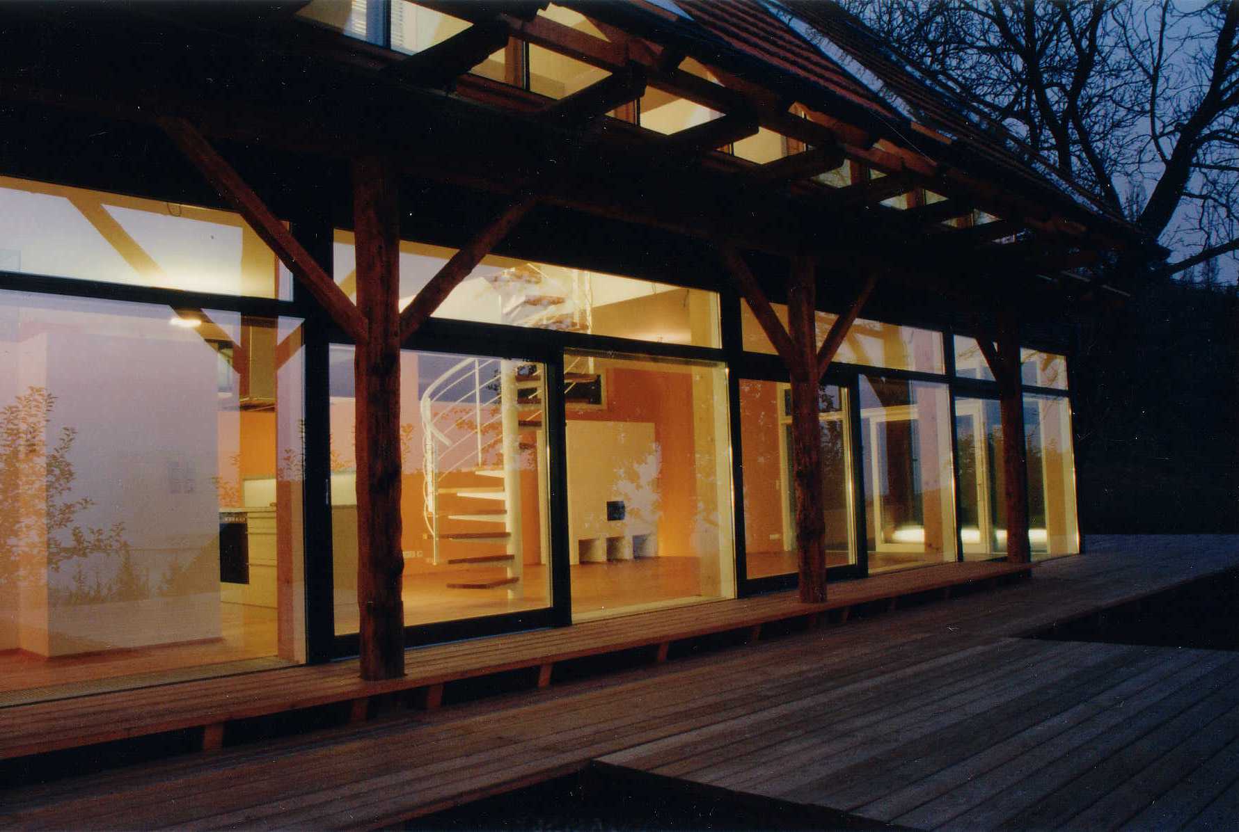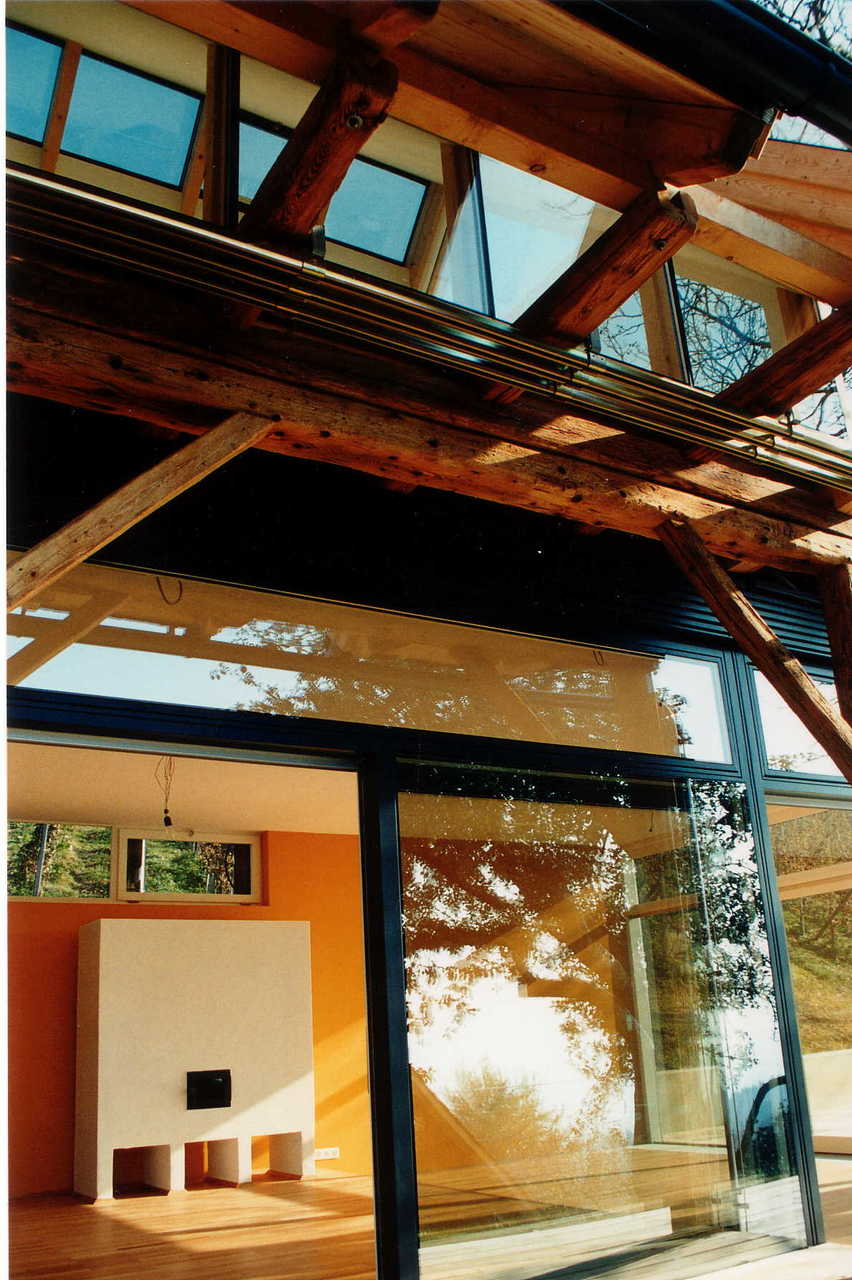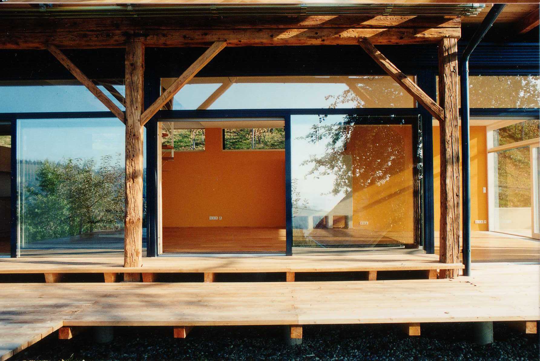Die wesentliche Änderung aber erfolgte im Bereich des hölzernen Bestandes, der ursprünglich als Scheune genutzt wurde und von dem lediglich die konstruktiven Teile erhalten wurden. In diesen „offenen Raum“ wurde ein Container in Holzständerbauweise eingefügt, der Wohn-, Koch- und Essbereich des Hauses beinhaltet. Auf zwei Stahlträgern aufgeständert ist er lediglich im Bereich der Türe zum gemauerten Bestand mit dem Rest des Gebäudes verbunden. Die vollständige Verglasung der West- und Südseite verstärkt die Wirkung des Containers ohne den Scheunencharakter aufzuheben, Vordach und Baumbestand bilden mit den Holzläden einen Sicht- und Sonnenschutz, großzügige Holzterrassen verbinden innen und außen.