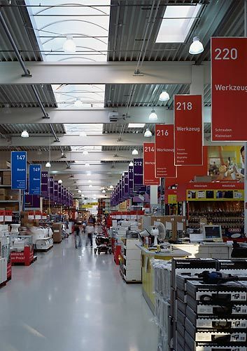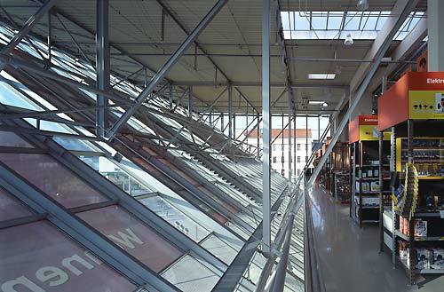Entgegen der üblichen Separierung von Gartencenter und Baumarkt in zwei getrennten Baukörpern sind hier die beiden Verkaufsbereiche unter einem – leicht gewölbten und begrünten – Dach vereint, das den unterschiedlichen Höhenbedarf auf zwei Geschossen mit einem Zwischengeschoss für Personal- und Büroräume sinnvoll löst. (Text: Gabriele Kaiser)
