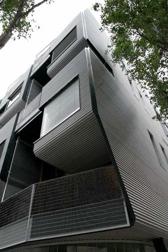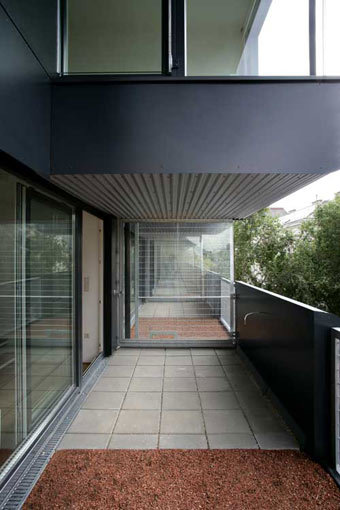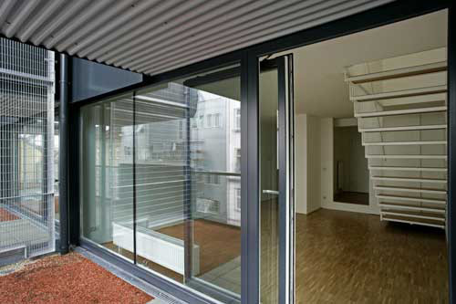Geiswinkler und Geiswinkler beweisen, dass sich das Prinzip der „gestapelten Einfamilienhäuser“ auch in diesem Umfeld erfolgreich realisieren lässt. Die Wohnungen sind zweigeschoßig angelegt und verfügen jeweils über einen raffiniert angelegten Freibereich, der aus einer kleinen Terrasse, einem Stück Wiese und einem „Vertikalgarten“ besteht und einen Puffer zwischen der Wohnung und dem Straßenraum bildet. Einblick in diesen Freibereich ist immer nur von Räumen der eigenen Wohnung aus möglich. Das Konzept ergibt für die Wohnräume eine erstaunliche Balance aus Öffnung und Intimität, die sich noch steigern wird, wenn die fünf Meter hohen Rankgerüste der seitlichen Loggienwände bewachsen sind. Die oft von Bauträgern geäußerte Behauptung, dass Bewohner in der dicht verbauten Stadt keine Loggien und Balkone wünschen, weil man diese nicht nutzen könne, wird hier eindrucksvoll widerlegt.