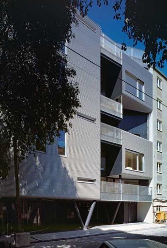 Auch im Wohnbau von Artec wird das Verhältnis zwischen Straßenraum und Gebäude neu ausgelotet. Die Baulücke liegt im Gefälle an der Schnittstelle zwischen zwei Bauklassen mit unterschiedlicher Bauhöhe. Der Entwurf löst den kompakten Block in eine rhythmisch gegliederte Anordnung von vor- und zurückspringenden Kuben auf. Durch diese Staffelung erhält einerseits der Straßenraum mehr Licht, andererseits entstehen bereits ab dem vierten Obergeschoß großzügige Dachterrassen. Die Wohnungen im ersten und zweiten Geschoß teilen sich einen vorspringenden Baukörper mit Fenstern, die einen Blick in die Tiefe des Straßenraums erlauben. Die Erdgeschoßwohnungen haben entsprechend dem Gefälle bis zu vier Meter Raumhöhe und hofseitige Gärten.