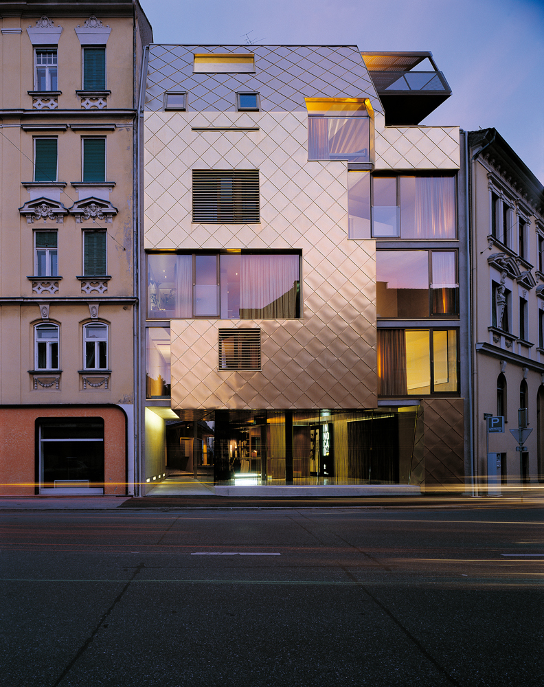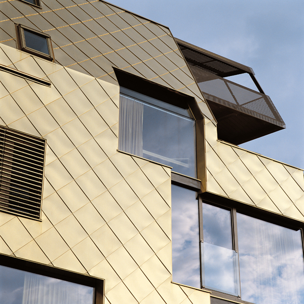 Die Raffinesse liegt auch in der Materialwahl, die sich außen wie innen konsequent durchzieht: Den 6-geschossigen Stahlbetonskelettbau zwischen den zwei seitlichen Feuermauern umhüllt eine Fassade mit TECU® Gold Rhombusschindeln, die sich über die Dachschrägen ziehen, das Hofhaus aus dem 18.Jhdt. ist verputzt - selbstverständlich in Gold. Im Inneren wechseln goldene Gipskartonwände und Sichtbetonwände einander ab, die Epoxydharzbeschichtung der Böden zieht sich in den Sanitärräumen über Wände und Decken.