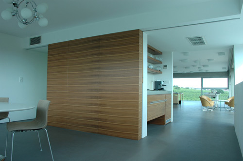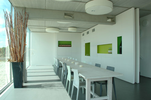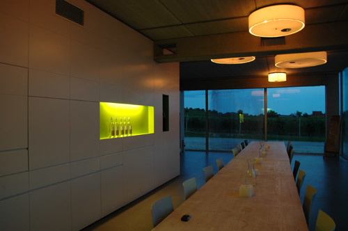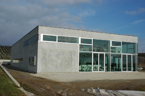 Der in seiner formalen Reduktion dem schlichten Gesamtkonzept entsprechende Innenausbau stammt vom Architektenteam AllesWirdGut, wobei grüngrundige Nischen im weißen Verkostungsraum farbige Akzente setzen und die „Geräumigkeit“ der Schrankwände spielerisch offenbaren. Das Büro im Obergeschoss beflügelt dank Panoramafenster den önologischen Weitblick. (Text: Gabriele Kaiser)