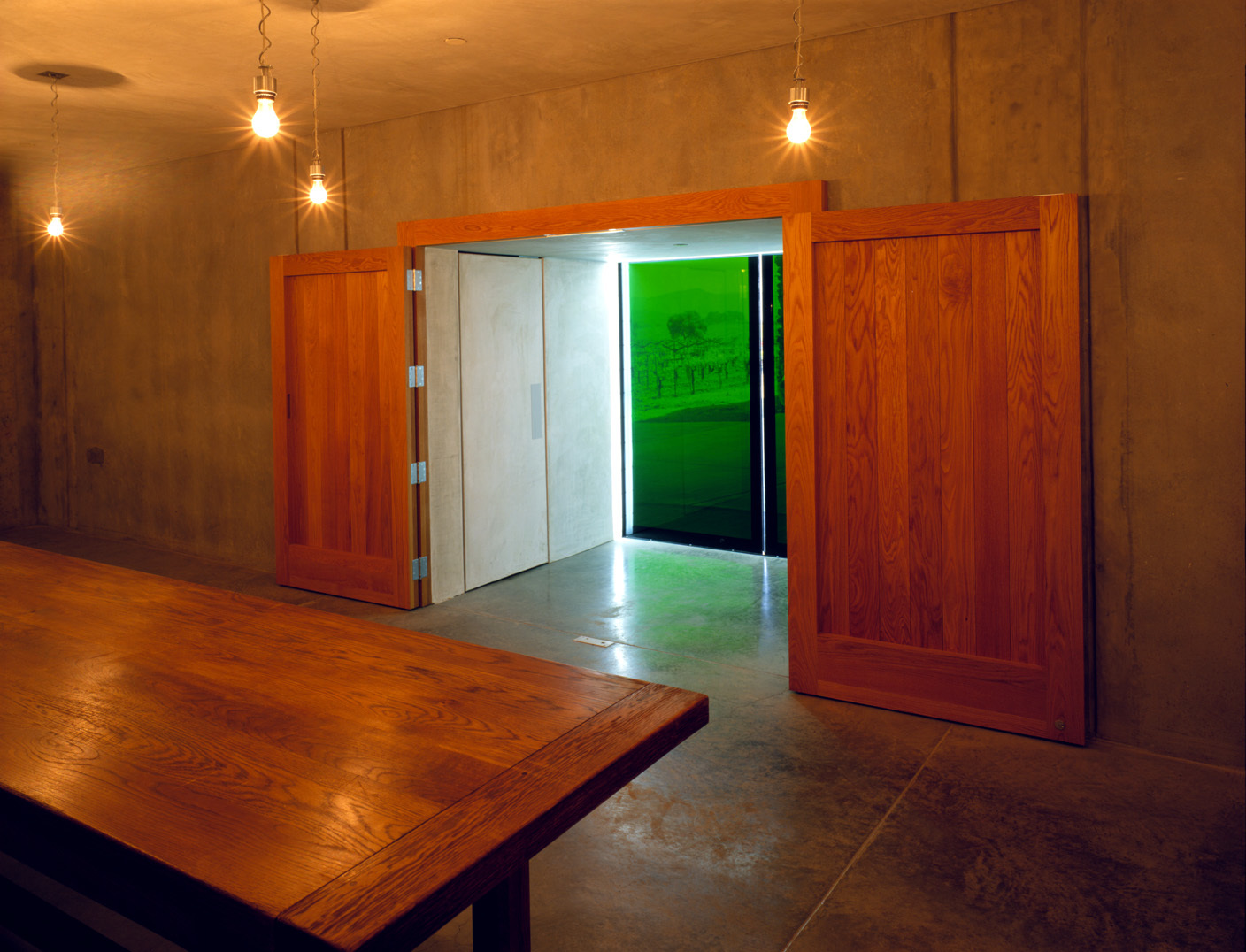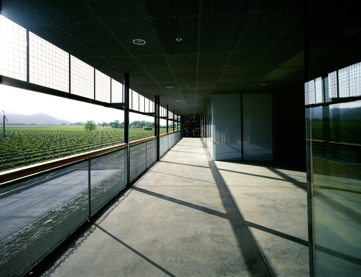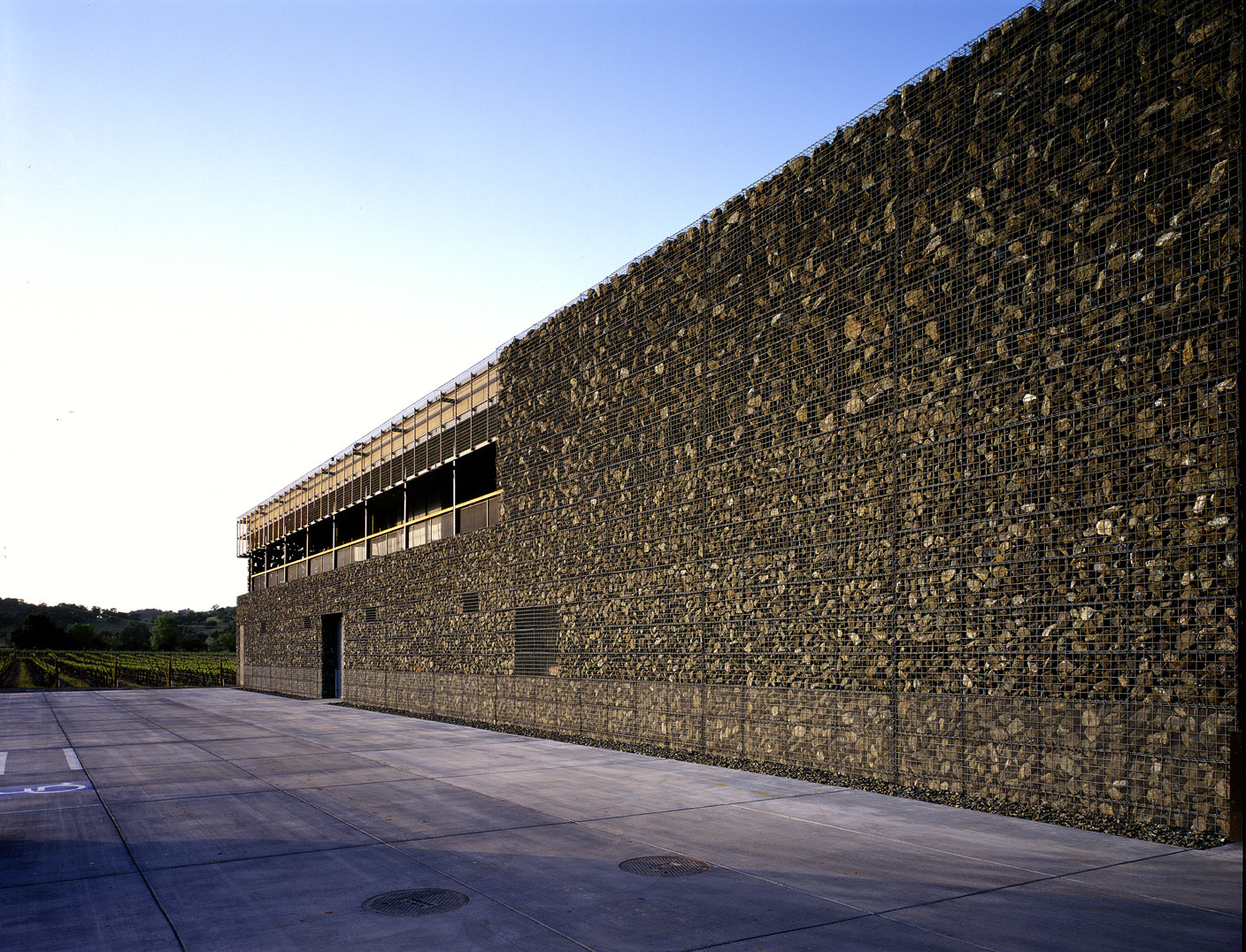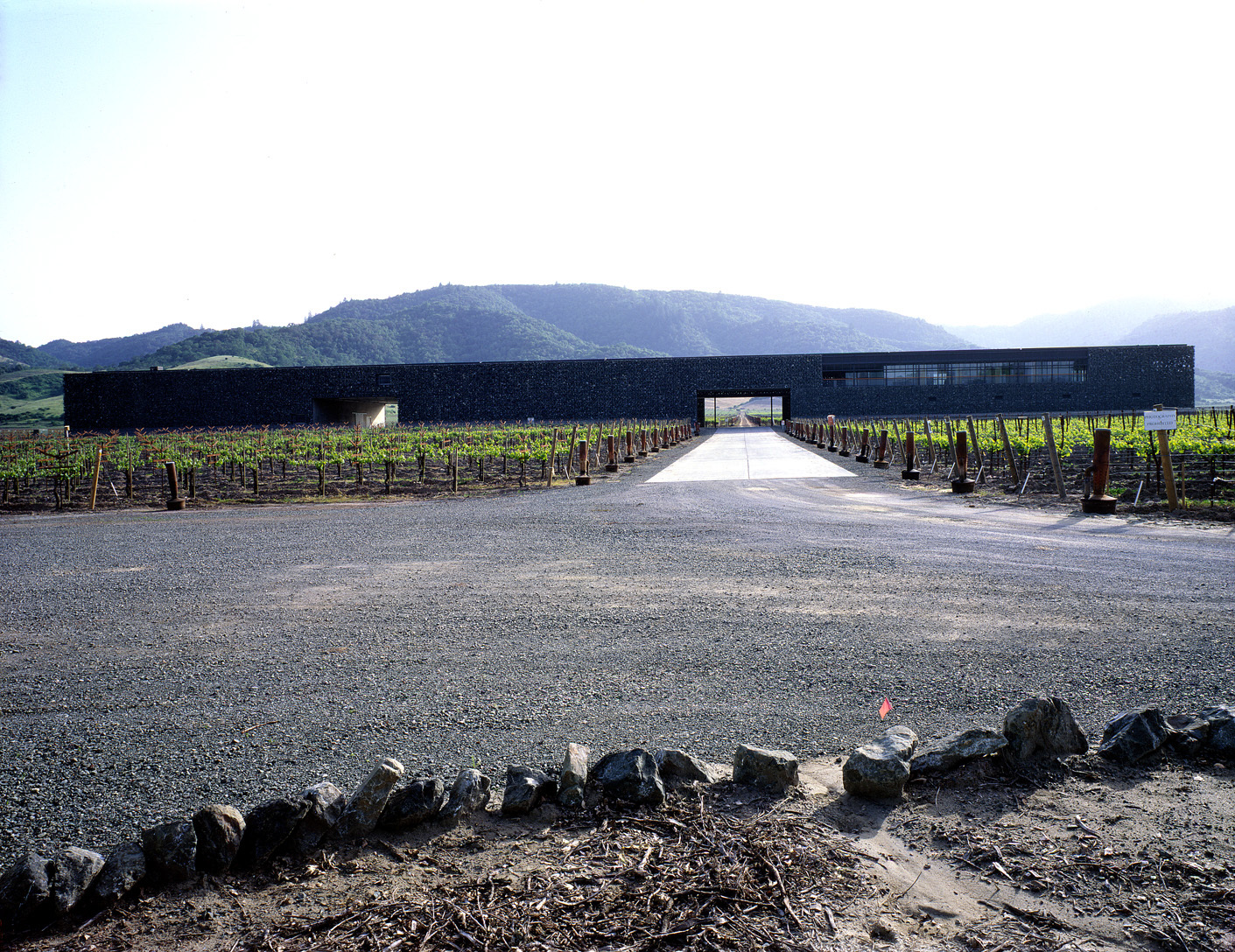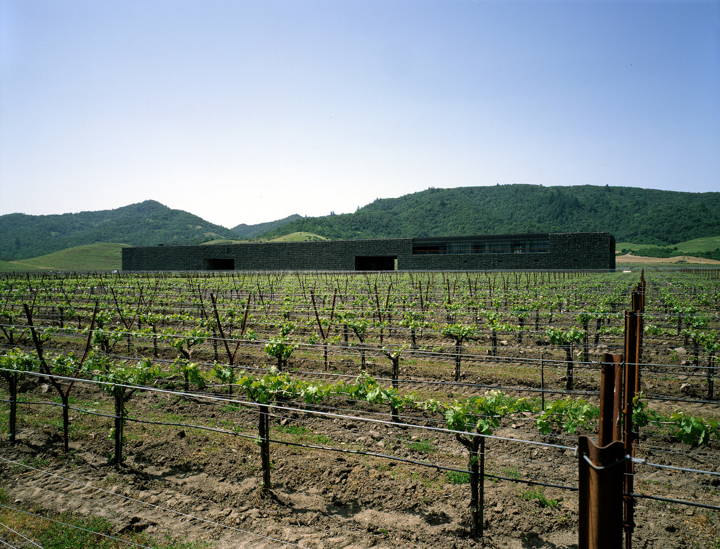Am nördlichen Rande von Yountville gelegen, ist die Dominus Winery weder Schaukellerei noch Degustationsstube, sondern Lager und Labor. So befleissigt man sich distinguierter Distanz: Ungebetene Besucher werden schon durch Hinweisschilder am Highway 29 abgeschreckt, den gekurvten Weg zu dem inmitten der Rebfelder befindlichen, breitgelagerten Gebäude einzuschlagen, dem ersten Gebäude, das Herzog & de Meuron in den USA realisieren konnten. Dunkelgrau zeichnet sich der langgestreckte Körper vor der sanften Hügelkulisse ab, erscheint des dunklen Farbtons wegen eher als Fläche oder Mauer denn als raumhaltiges Volumen. Das Innere ist streng funktional organisiert und gemäss dem Prozess der Weinherstellung gegliedert: ein Raum mit grossen Chromstahlbehältern für die erste Phase der Fermentierung, ein Barrique-Keller mit Eichenfässern und Degustationstisch, ein Flaschenlager; über dem Barrique-Keller Räumlichkeiten für Verwaltung und ein kleines Labor. Stahl und Beton bilden die Hüllen der axial angeordneten Bereiche. Nichts Spektakuläres also, wäre da nicht die steinerne Verkleidung, durch welche die drei Bauteile zu einem kompakten, von Ferne monolithisch wirkenden Kubus vereint werden. Zwei Durchfahrten trennen die funktionalen Einheiten und ermöglichen den Durchblick durch das Gebäude auf die hinter der Winery befindlichen Rebhänge.