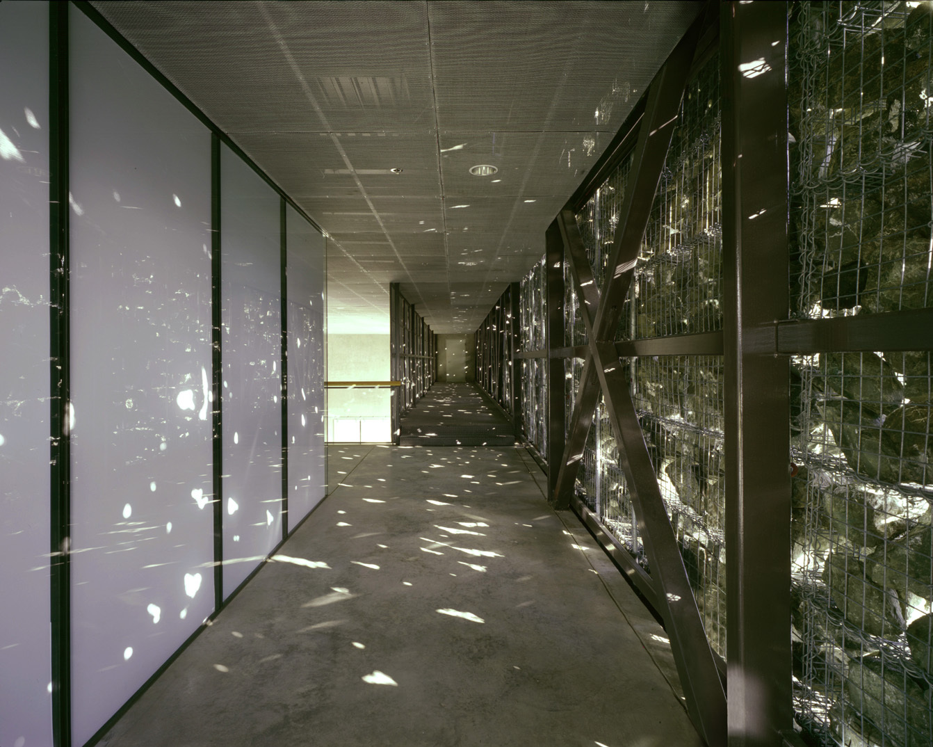 Die wohl eindrücklichste Perspektive bietet der Blick durch die von hängenden Schürzen aus Gabions überfangenen Durchfahrten. Das Tageslicht fällt gedämpft durch das Sieb der Steine hindurch, die ins Schweben zu geraten scheinen. Faszinierend ist die Tatsache, dass sich die üblichen Relationen von Leichtigkeit und Schwere, Fragilität und Massigkeit umkehren. Seiner traditionellen architektonischen Funktion entkleidet, Mauern zu bilden und Massen abzutragen, ist der Stein nur mehr er selbst; der konstruktive Part scheint an die Drahtgitterelemente delegiert. Erst aus weiterer Ferne werden die Gitternetze unsichtbar, verdichten sich die Steinbrocken optisch zur Mauer.