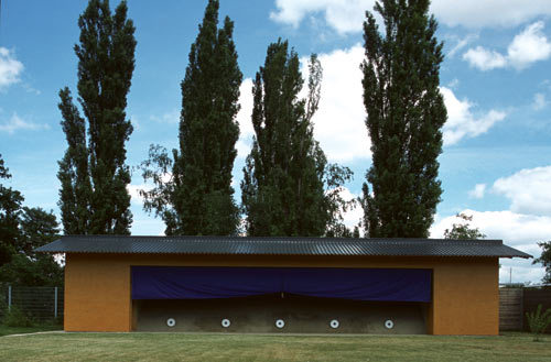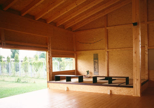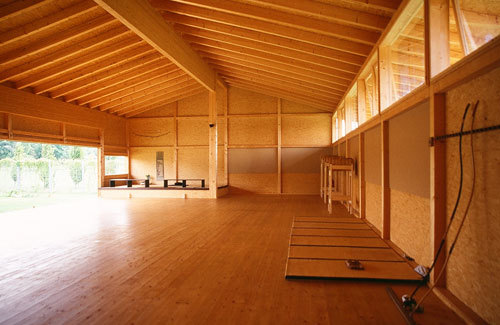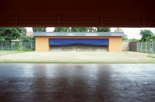Obwohl beide Baukörper aus Holz konstruktiv und formal eine angenehme Neutralität ausstrahlen, also keine dezitierten Eigenschaften weder des Stadelhaften noch des augenscheinlich „Japanischen“ aufweisen, teilt sich beim Betreten der Abschusshalle die Besonderheit des Raums unmittelbar mit. Das mag an den Proportionen des Gebäudes liegen, an seiner ungewohnt starken Ambivalenz zwischen Innen- und Außenraum, aber auch an seiner „Einrichtung“: am Zuseherpodest, wo nach japanischer Tradition Tee getrunken und die Ruhe eines „nichtreligiösen Sakralraums“ genossen werden kann, sowie an den kraftkonzentrierten Instrumenten und Requisiten des Bogenschießens selbst. (Text: Gabriele Kaiser)