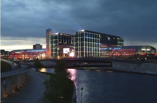 Humboldthafen und Brachland machen die gläserne Space-Age-Röhre mit den aufgebockten Bürohäusern des Hamburger Architekturbüros von Gerkan, Marg und Partner zum High-Tech- Raumschiff inmitten einer innerstädtischen Mondlandschaft. Selbst im Spreebogenpark am anderen Ufer, jener ernüchternden Art leer gefegter Landschaftsarchitektur, sieht man kaum Menschen. Was ursprünglich ein Ort für Bürger mitten im Regierungsviertel sein sollte, lässt Jogger, Radfahrer und selbst Hunde zügig vorbeiziehen. Die Hauptstädter haben der unwirtlichen Gegend mit dem «Bundespressestrand», einem Open-Air-Restaurant mit aufgeschüttetem Sandboden und Strandkörben eine kleine Insel abgetrotzt. Dank der Weite, die sich nach Westen hin öffnet, gibt es hier an Sommerabenden den längsten Berliner Sonnenuntergang zu bewundern.
