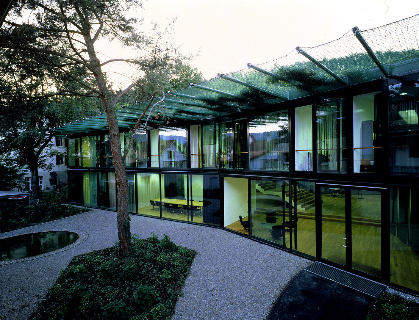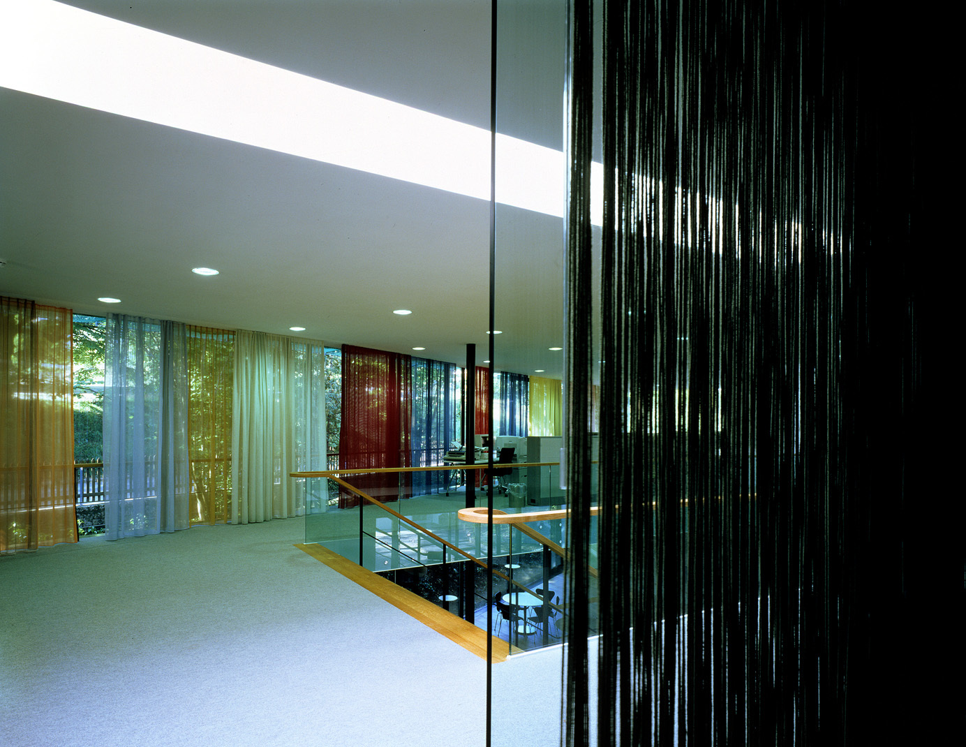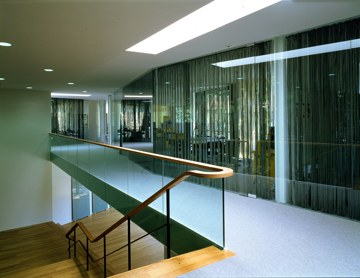 Die breite Freitreppe, die sich für Veranstaltungen in eine theaterartige Sitzfläche umfunktionieren lässt, ist das Herzstück der promenade architecturale. Sie führt vom offenen, mit Photoporträts von Thomas Ruff geschmückten Repräsentationsraum im Erdgeschoss hinauf in die Büroetage. Glas dominiert auch dort. Es bestimmt die Beziehung zwischen den Grossraum- und Einzelbüros und der Aussenwelt. Dank riesigen Fensterflächen, die individuell aufgeschoben werden können, lässt sich die Bürolandschaft gleichsam in eine Gartenveranda verwandeln. Der Fluss des architektonisch bewusst nicht definitiv gefassten Raums wird allerdings durch die von Adrian Schiess und Rosemarie Trockel entworfenen Vorhänge gebremst. Damit wird ihre Kunst zum integralen Bestandteil der Architektur.