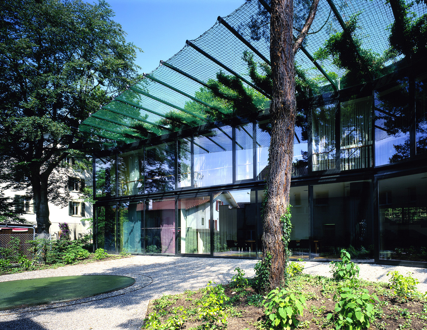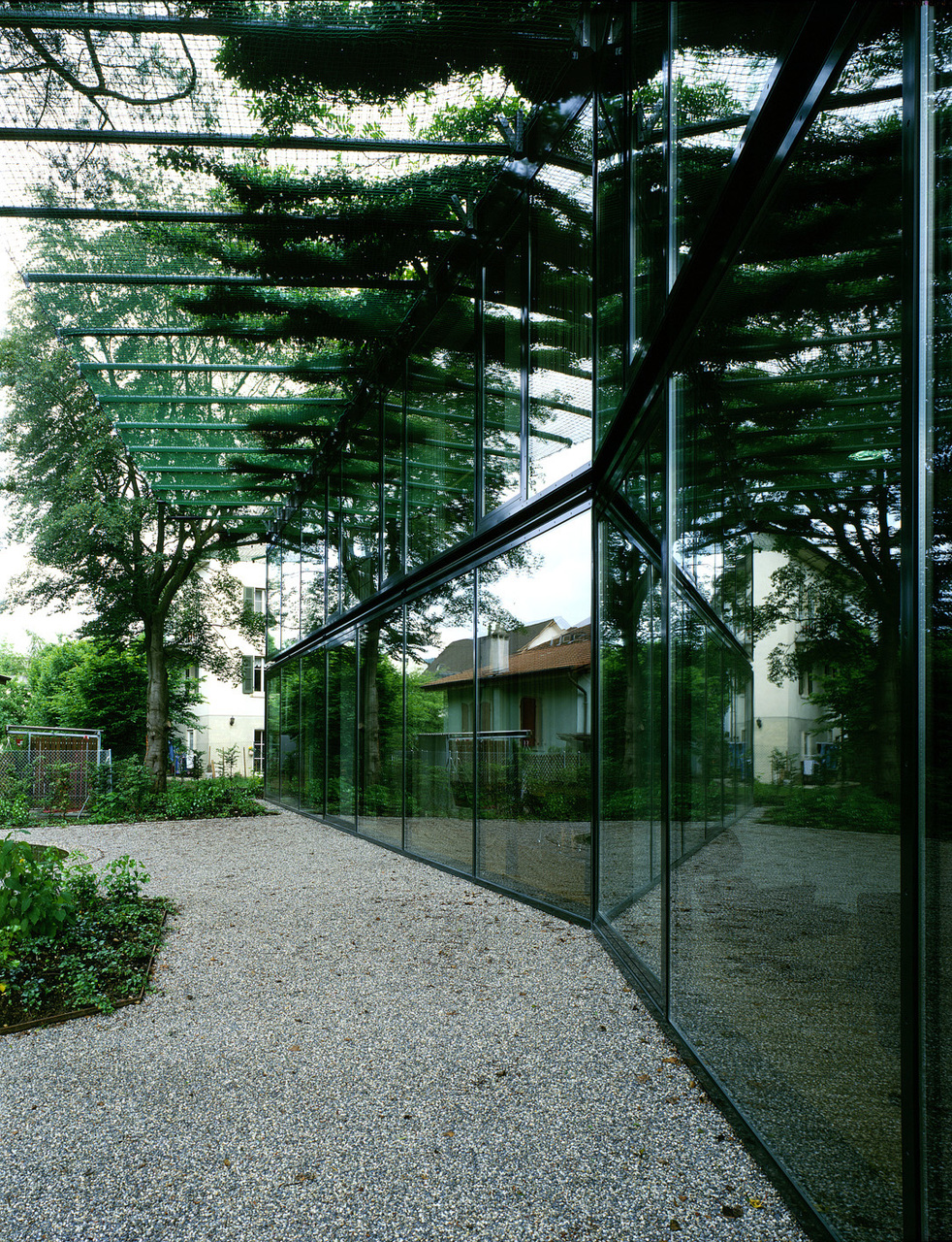 Das über einem trichterförmigen Grundriss errichtete Bauwerk mit dem auskragenden Efeudach ist das bis anhin anmutigste Gebäude von Herzog & de Meuron, finden in ihm doch Architektur, Natur und Kunst zu einer Einheit. Darüber hinaus ist es der erste Bau der Basler Architekten, der im Grunde nur aus Raum besteht. Jacques Herzog betont denn auch, dass sie hier vor allem «der Aussenraum, der Zwischenraum sowie die Art, wie der Raum das Haus durchdringt», interessierte. Das Gebäude mit den charakteristischen Einknickungen an Seiten, das sich in seiner Durchsichtigkeit ganz auf den von Günter Vogt gestalteten Garten und den dahinter ansteigenden Hang bezieht, hat keine definitive Form, kein sofort erkennbares Volumen. Die fast durchgängige Verglasung - nur zum Parkplatz hin sind einige mit grünen Tarnnetzen bespannte Mauerflächen auszumachen - lässt aber den Aussenraum eindringen und macht aus diesem Haus eine Art objet cache-toi.
