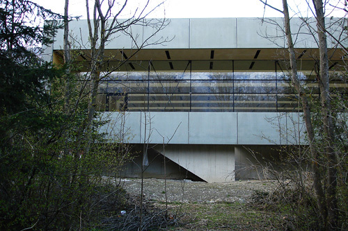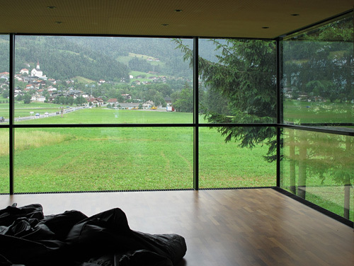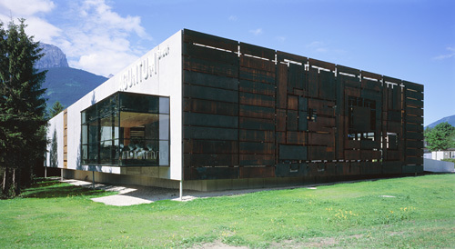 Die Cortenstahlfassade im Norden zitiert den Grundriss des Atriumhauses in verfremdeter Form. Sie ist gleichzeitig Anreiz zum Besuch und Schutz des Inneren vor den Verkehrsauswirkungen. Im Süden ist der hallenförmige Raum völlig verglast und öffnet sich zu den Baumkronen des Auwaldes – ein optischer Abschluss, der sich im Laufe des Tages und des Jahres ständig verändert. (Text: Claudia Wedekind)
