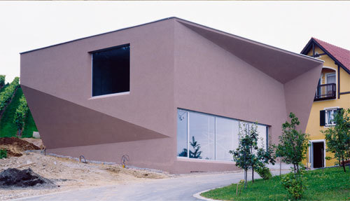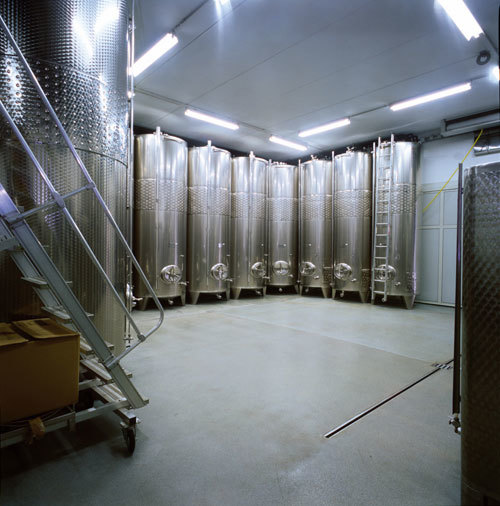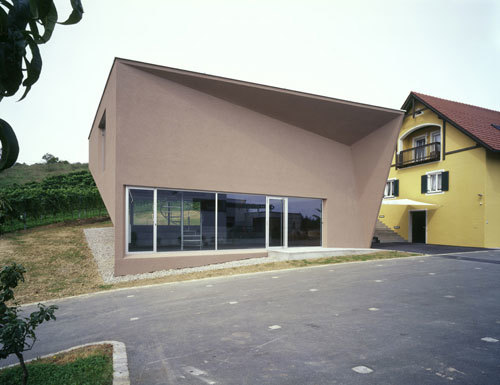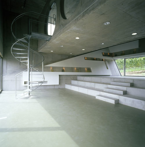 Man betritt das Gebäude ebenerdig an der breitesten Seite der Verkaufszone, über beheizte Arenastufen gelangt man zum höhergelegenen Degustationssalon. Von hier hat man einen direkten Ausgang zur Weingartenterrasse. Große Glasflächen erlauben den Blick auf den Weingarten, der dem Salon je nach Jahreszeit ein unterschiedliches „Bild“ gibt. Der schlichte, rauhe Betoninnenraum wird von einem lebhaften, mäanderförmigen glatten, weißen Präsentationsband strukturiert. Dieses Band beinhaltet die gesamte Haustechnik, Beleuchtung etc. Die Bodenfarbe ist analog zur Farbigkeit des Erdreiches gehalten. Neben dem Verkauf und der Präsentation von Wein dient der Raum für Konzerte, Seminare, Ausstellungen und Film und Videopräsentationen. (Text: Architekt:innen)
