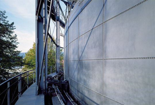 Schon während der Reinigungsphase hatte sich gezeigt, dass die Bauvorgänge hohe Anforderungen an Planung und Bauleitung stellen. Darum beschloss man zu diesem Zeitpunkt, ein Planungsteam mit weiteren Fachleuten zusammenzustellen. Auch stellten sich bald derart grundlegende Fragen, dass die Bauherrschaft sich stärker einbringen musste. Schon nach wenigen Wochen stiess man nämlich auf einen Sachverhalt, der in der Machbarkeitsstudie übersehen worden war und der das vorgesehene Nutzungs- und Sanierungskonzept zu Fall bringen sollte: Ohne inneren Gasdruck würde die nur 2.5mm dicke Blechhülle unter Windeinfluss unweigerlich zerbeult werden (vgl. Artikel S. 10). Als weiterer Stolperstein für das vorgesehene Nutzungskonzept erwies sich die Wasserführung. Die Tassen, die die drei Teleskope gegeneinander abdichten (vgl. Kasten), sind so konstruiert, dass Regenwasser, das auf die Kalotte fällt, ins Innere des Gasometers überläuft. Um das zu verhindern, hätten entlang aller Tassen Abdichtungen (Spenglerarbeiten) angebracht werden müssen – eine gestalterisch und denkmalpflegerisch überaus schwierige Aufgabe.